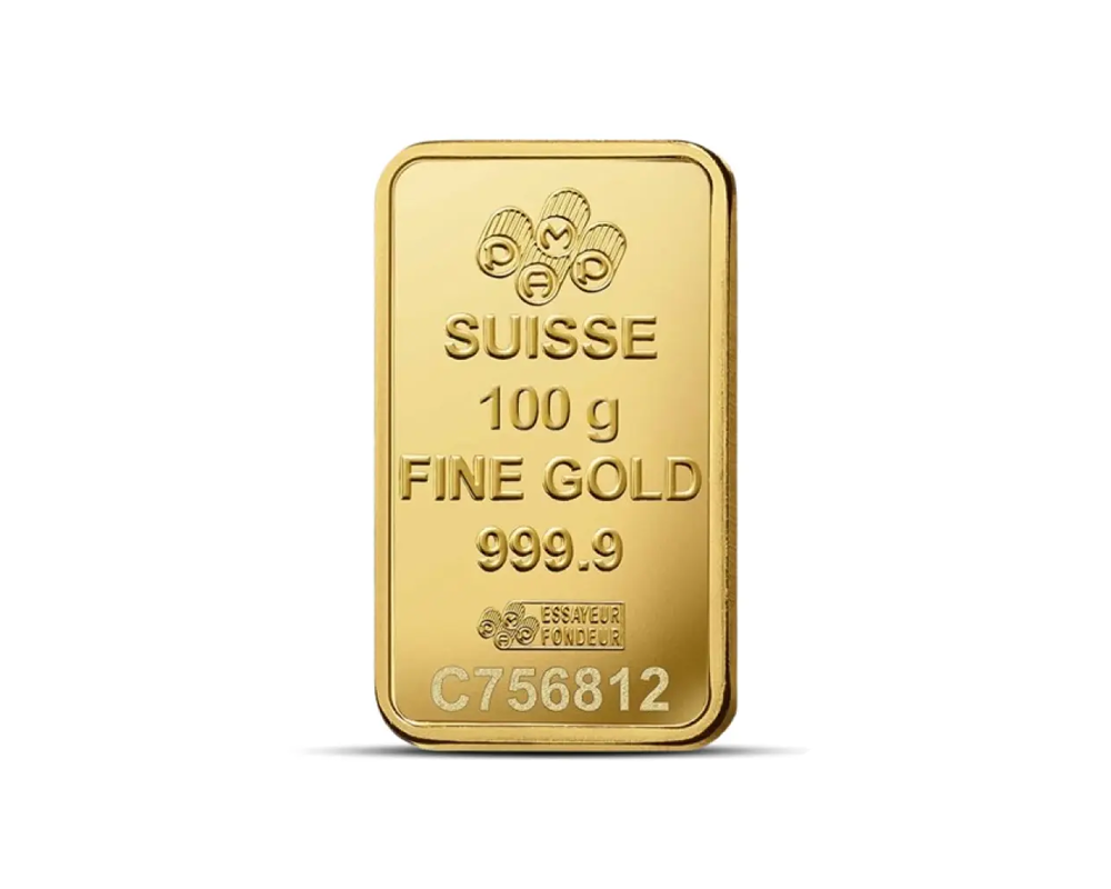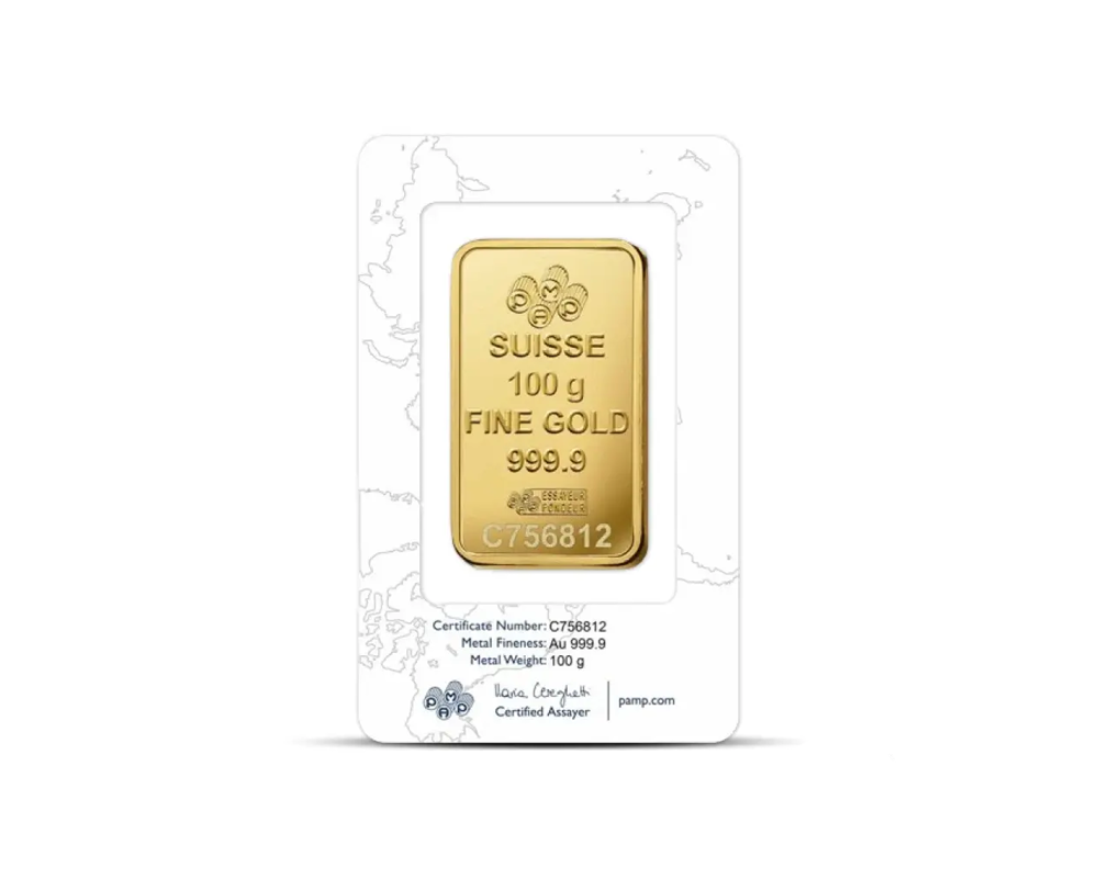 This PAMP 100 Gram of .9999 fine gold bar, originating from Switzerland, features an elegant Rosa (rose) design. In the other side, the PAMP logo, purity, weight with unique serial number.