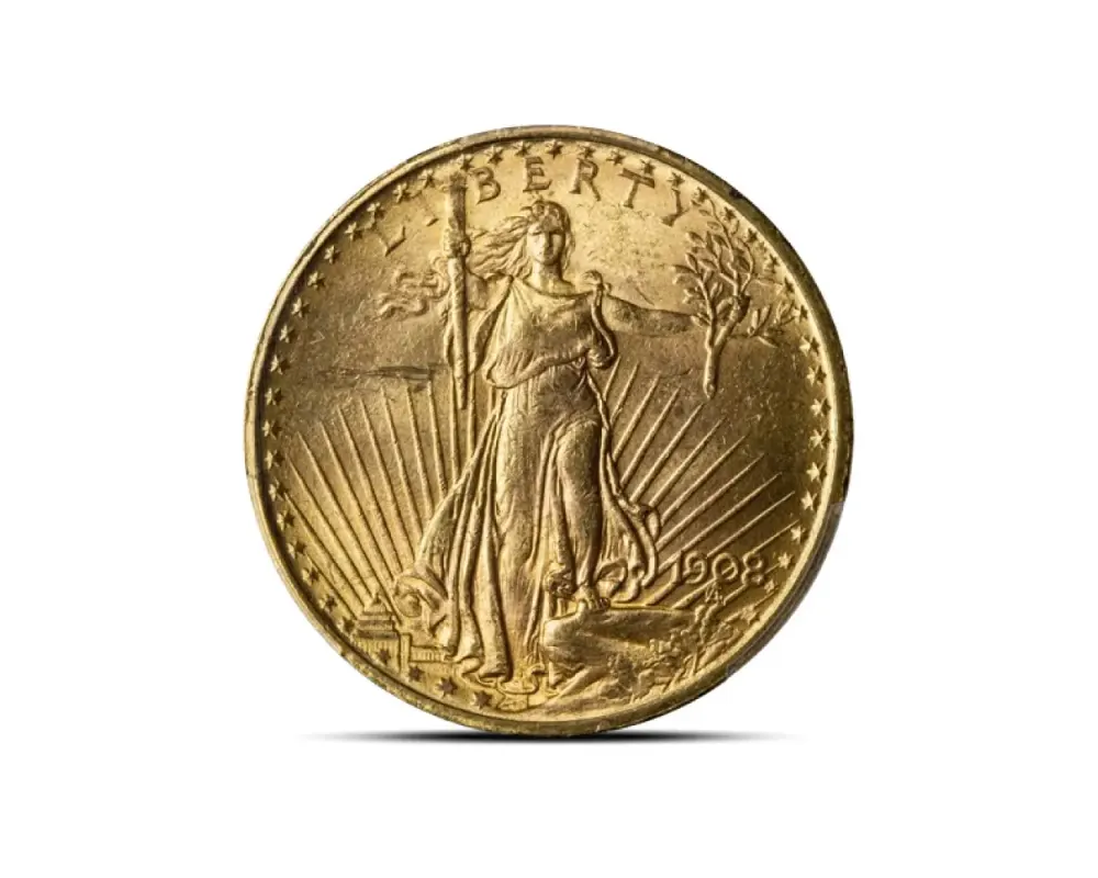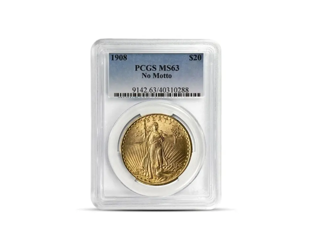 This 1908 – $20 St Gaudens “No Motto” of .900 fine gold coin, graded MS63 by NGC or PCGS, is a magnificent and historically significant piece. Designed by Augustus Saint-Gaudens, it features his iconic Liberty striding forward on the obverse and a powerful eagle in flight on the reverse.