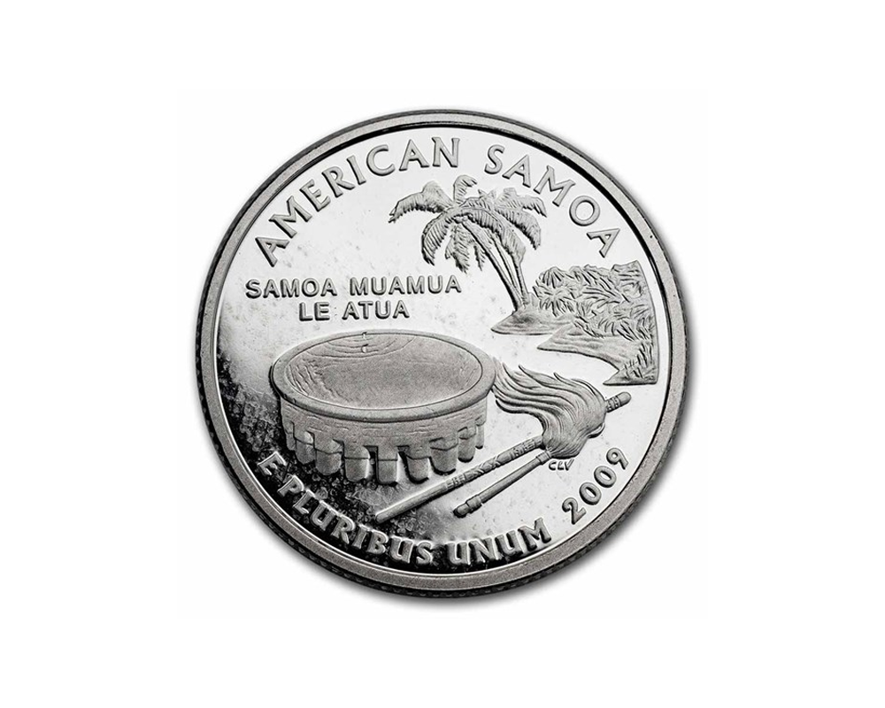 This 2009 S America the Beautiful Quarter is a .900 fine silver proof coin of American Samoa by the United States Mint. It features an ava bowl, whisk, staff, and a coconut tree.