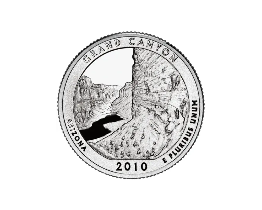 This 2010 S America the Beautiful Quarter is a .900 fine silver proof coin of Grand Canyon by the United States Mint. It features a design honoring Grand Canyon National Park.