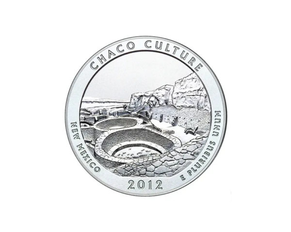 Struck in 5 oz silver by the U.S. Mint, the obverse bears the portrait of George Washington. The reverse depicts a view of Chetro Ketl and the north wall of Chaco Canyon with .999 fine silver purity.