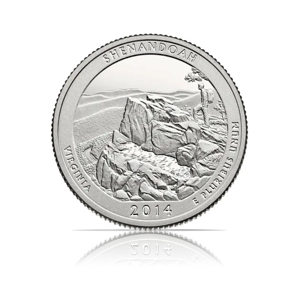This 2014 S America the Beautiful Quarter is a .900 fine silver proof coin of Shenandoah by the United States Mint. It features a design depicting a day hiker taking in the view from Little Stony Man summit.
