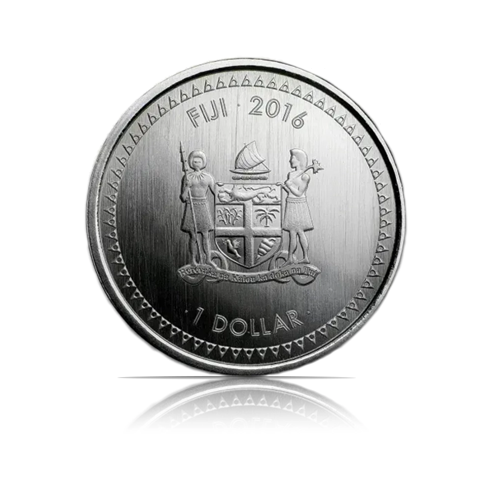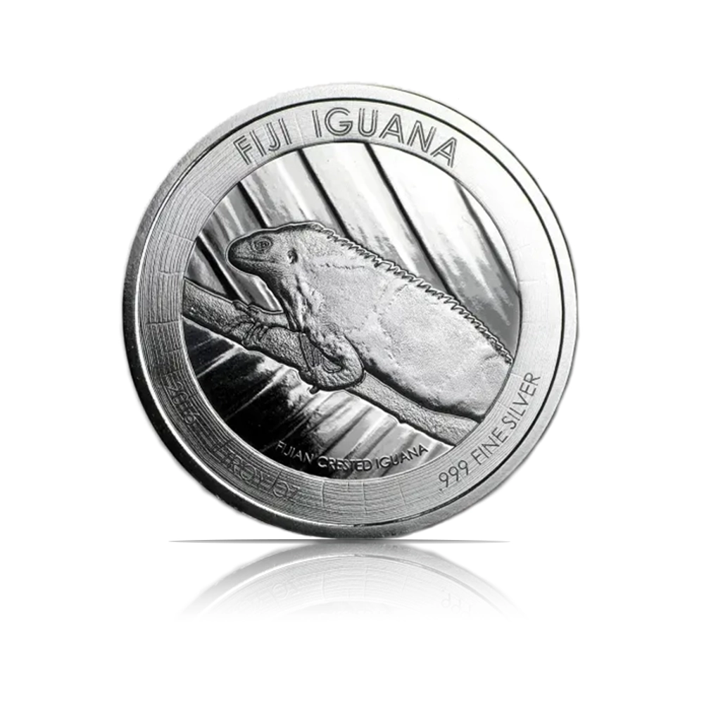This 1 oz silver coin from the Scottsdale Mint is part of the Fiji Wildlife series. The obverse bears the Fiji coat of arms, while the reverse showcases the endangered Crested Iguana and the .999 fine silver purity. Limited mintage of 75,000 coins.