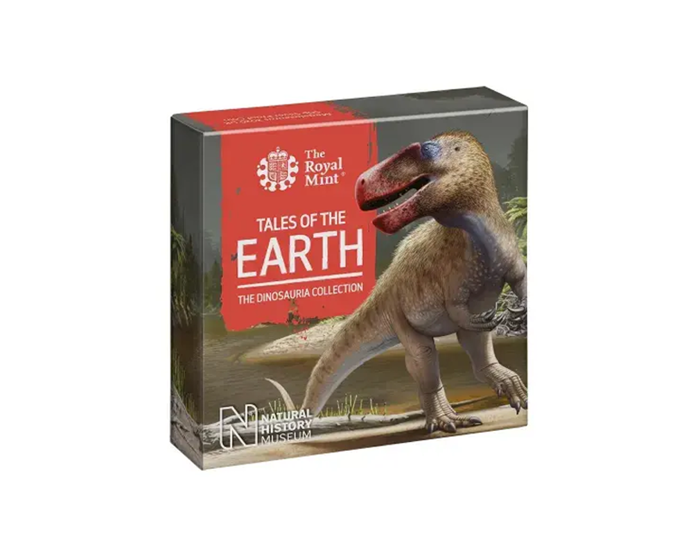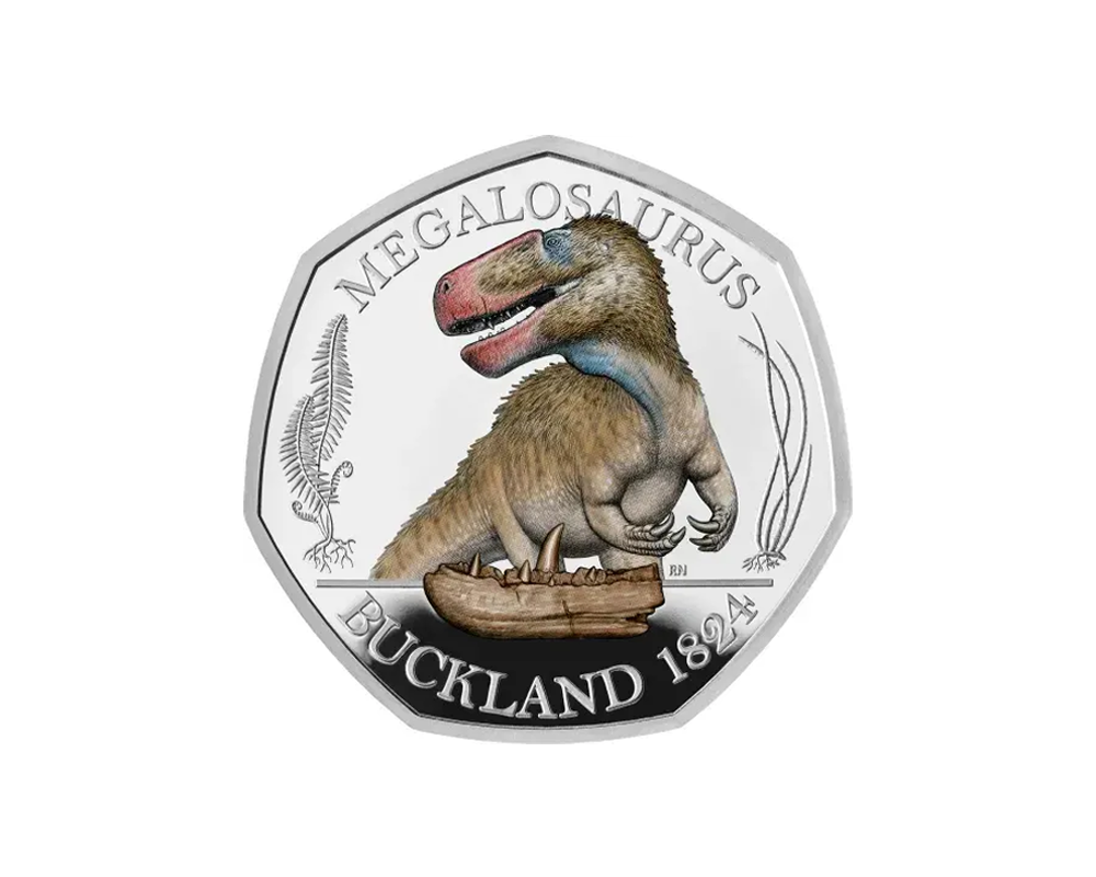 A vibrant, limited-edition coin! This 2020 Royal Mint Megalosaurus 8-gram .925 sterling silver proof coin features a prehistoric beast in full color.