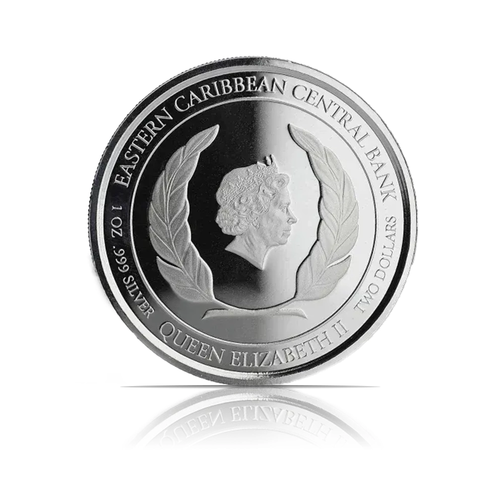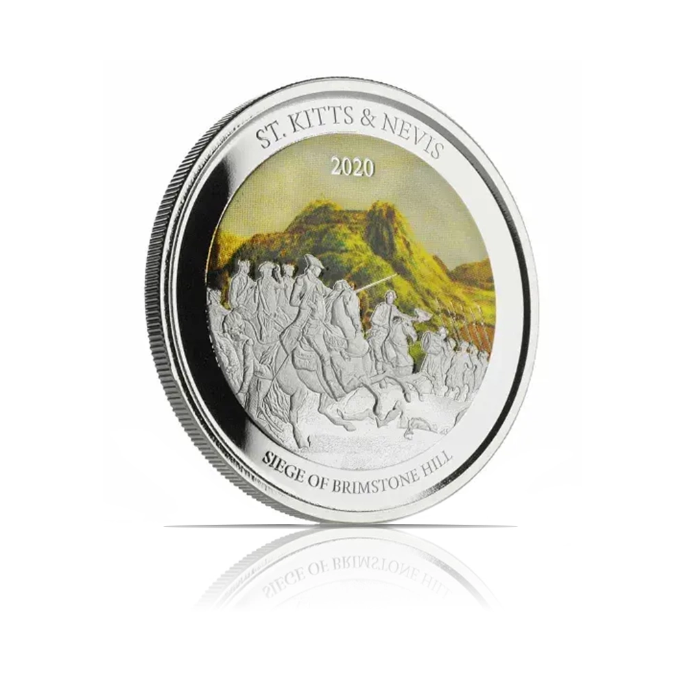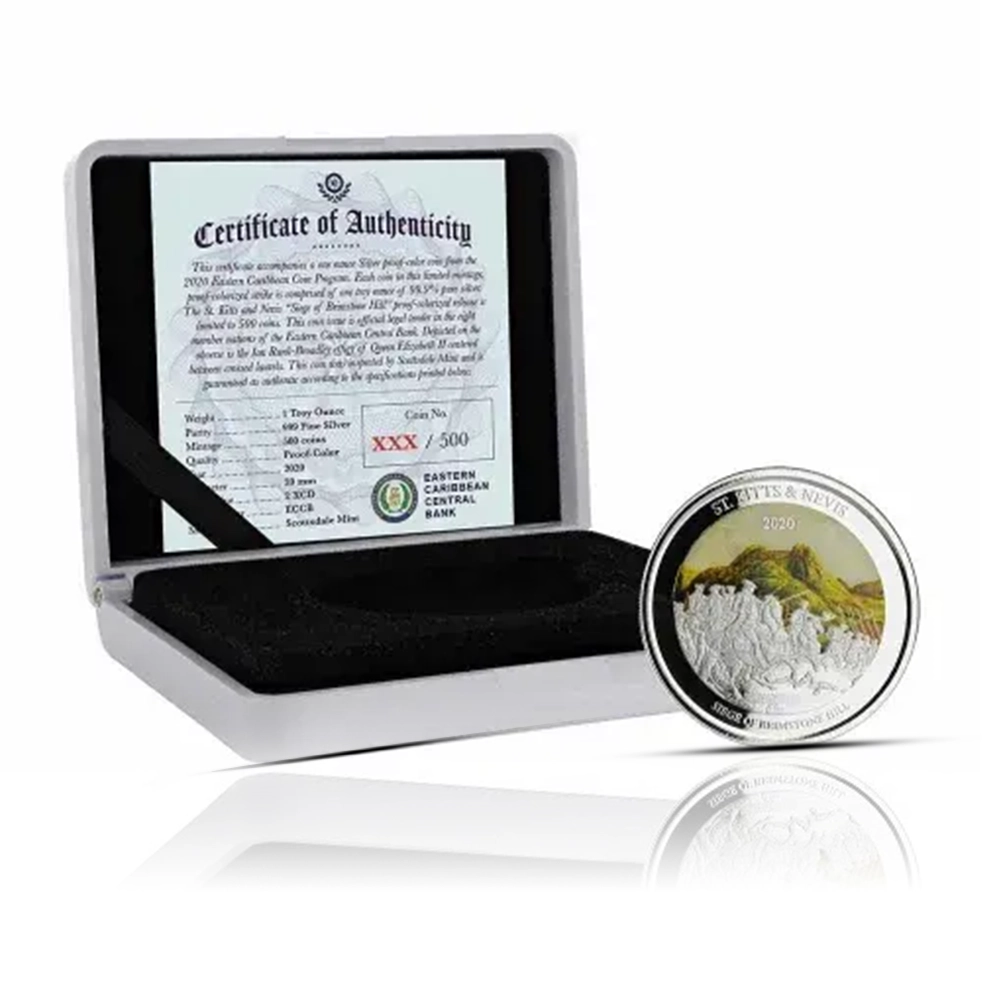 This 2020 1 oz silver proof coin from the Scottsdale Mint is part of the EC8 series. The obverse features Queen Elizabeth II, while the reverse displays a colorized view of Brimstone Hill Fortress and the .999 fine silver purity. Limited mintage of 500 coins.