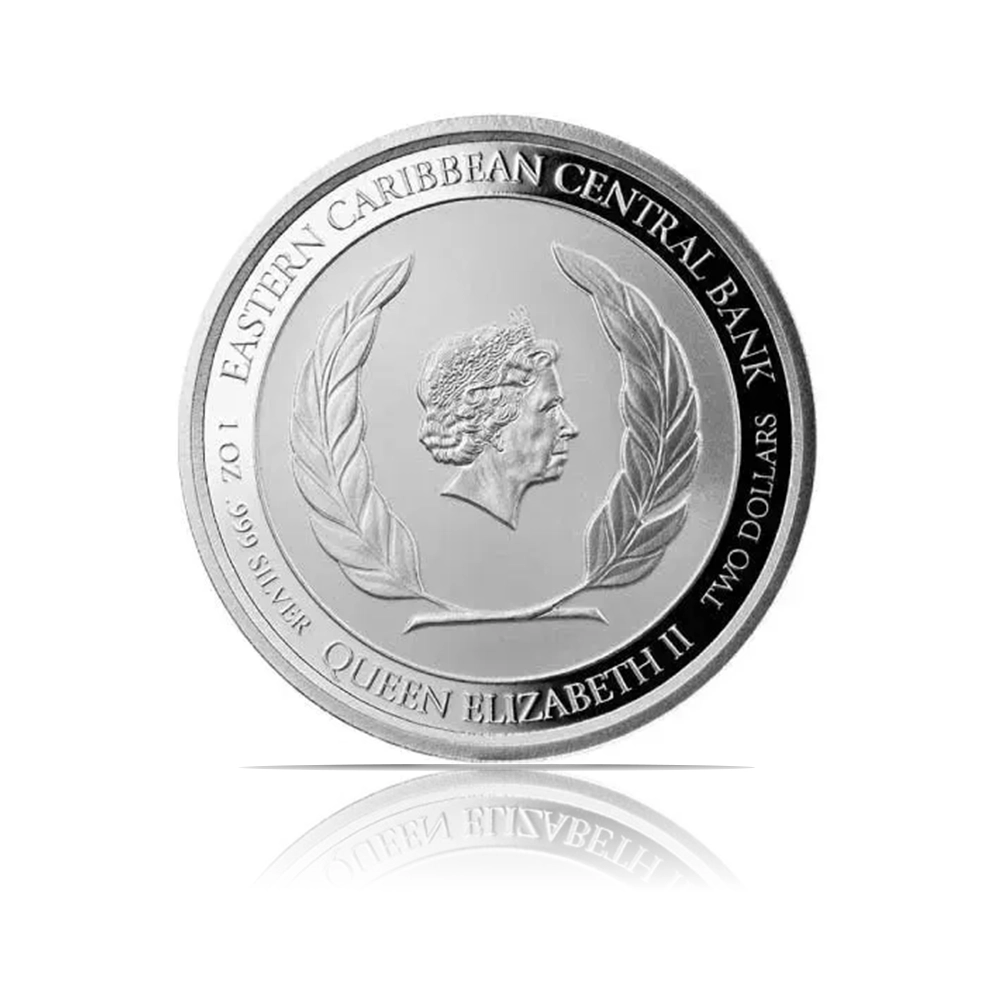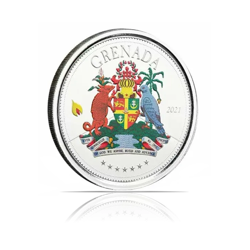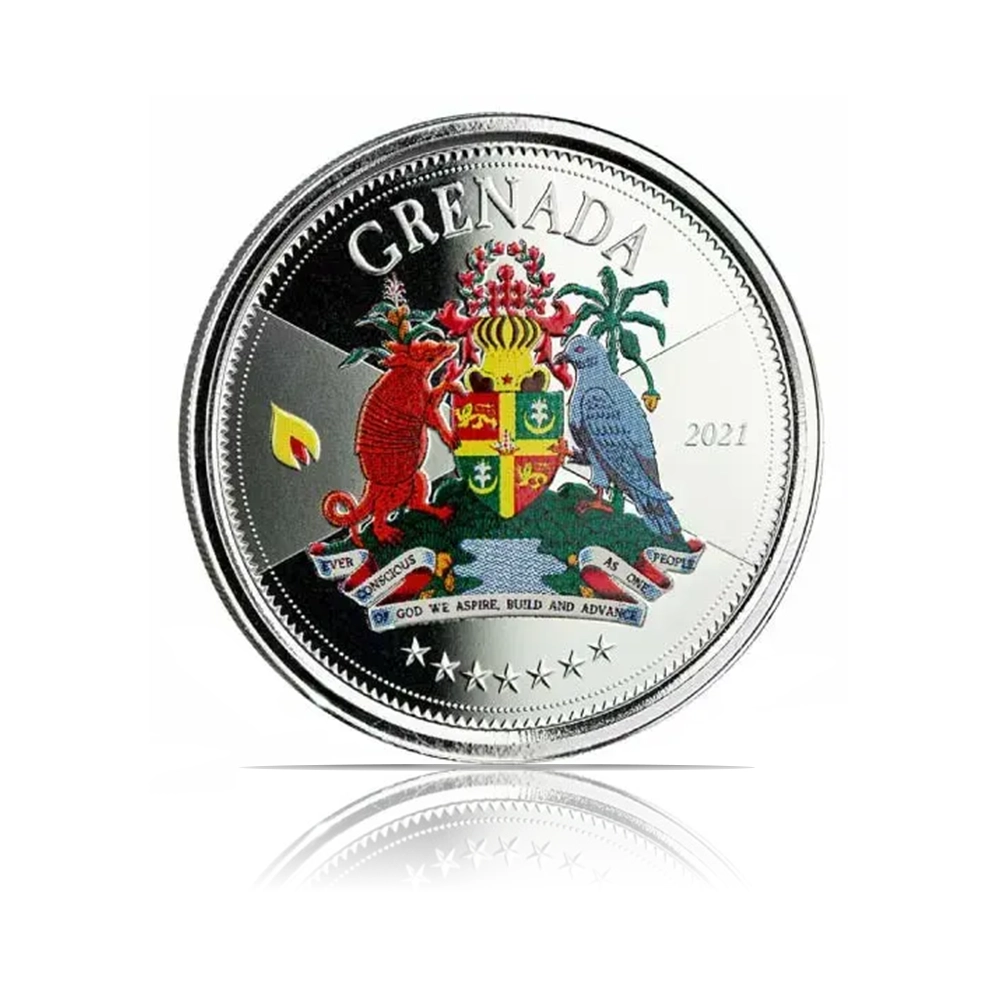 Minted in 2021 by the Scottsdale Mint for the EC8 series, this 1 oz silver proof coin features Queen Elizabeth II on the obverse. The reverse depicts a colorized Grenada Coat of Arms and the .999 fine silver purity. Limited mintage of 500 coins.