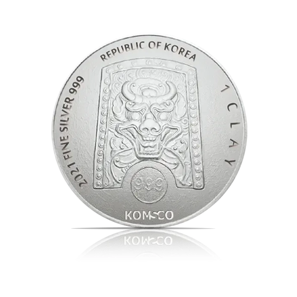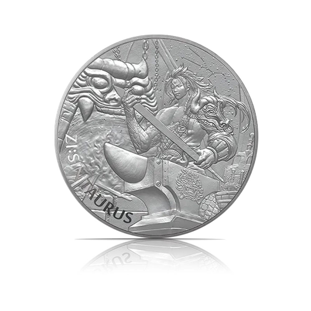 A 2021 Brilliant Uncirculated (BU) by KOMSCO in South Korea, this medal contains 1 oz of .999 fine silver. It is the fifth release in the ZI:SIN series and portrays the powerful guardian Taurus forging a sword.