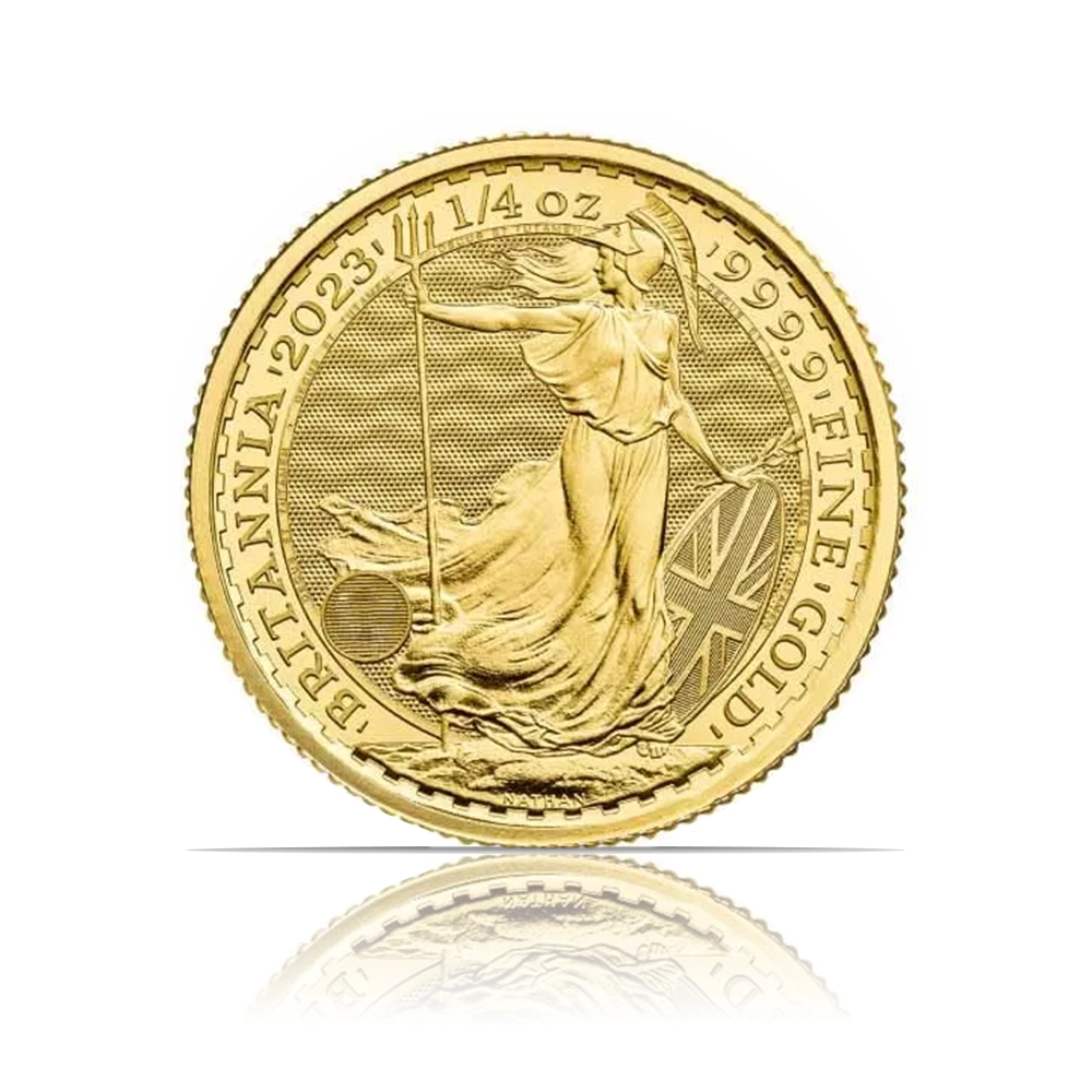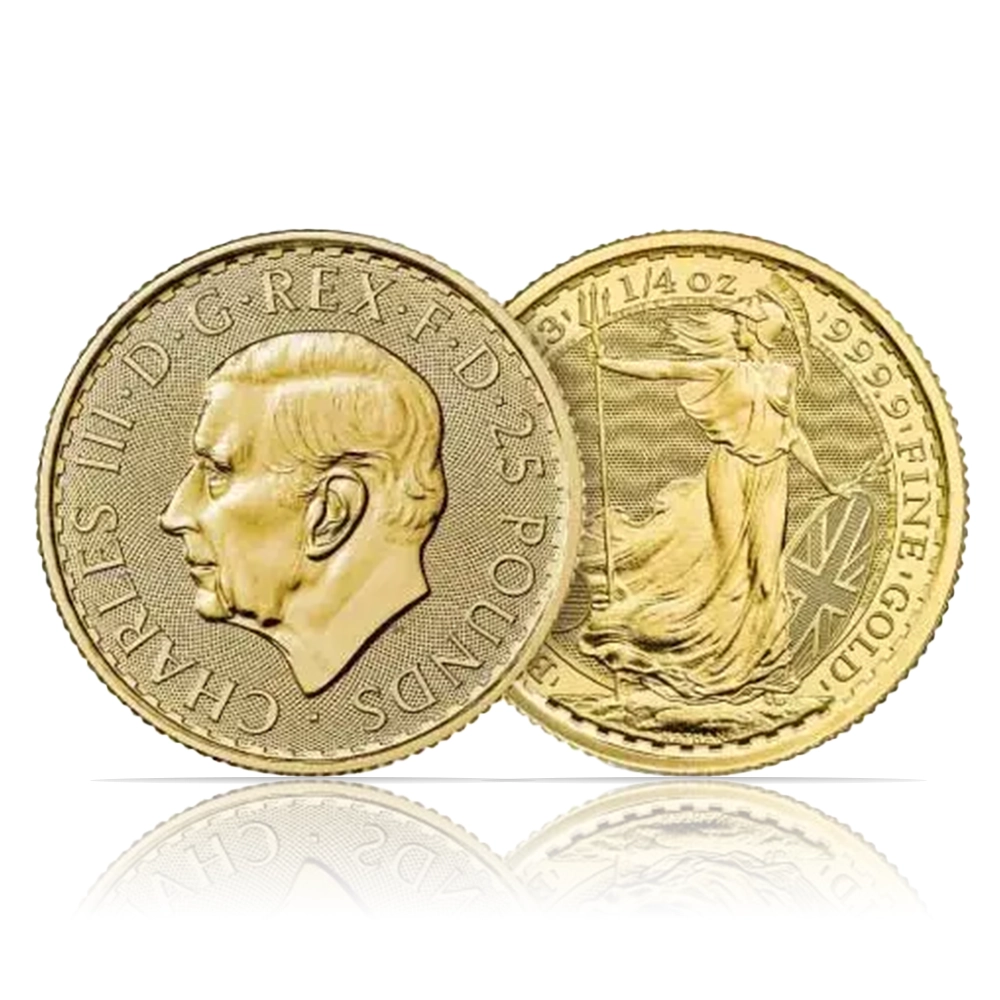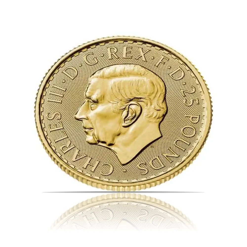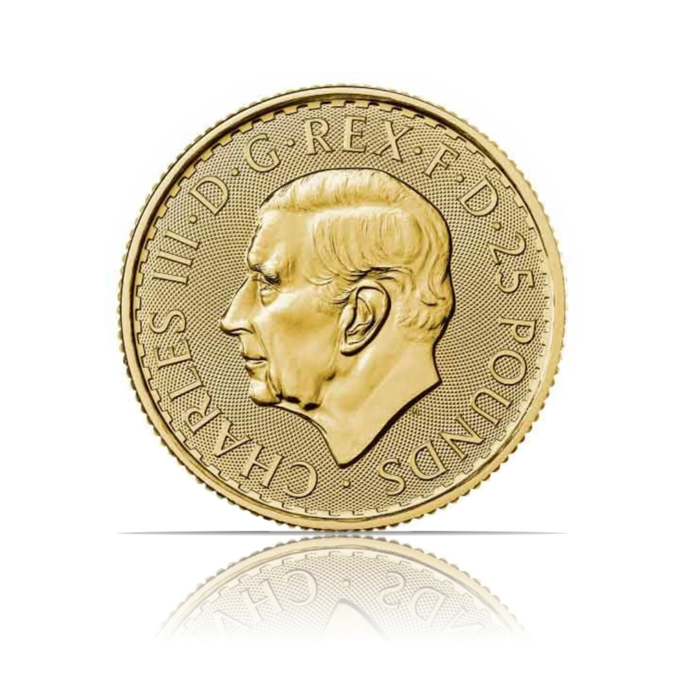 Struck in 1/4 oz gold by The Royal Mint, this Brilliant Uncirculated coin features the first definitive coinage portrait of King Charles III on the obverse. The reverse displays the iconic standing Britannia with .9999 fine gold purity.