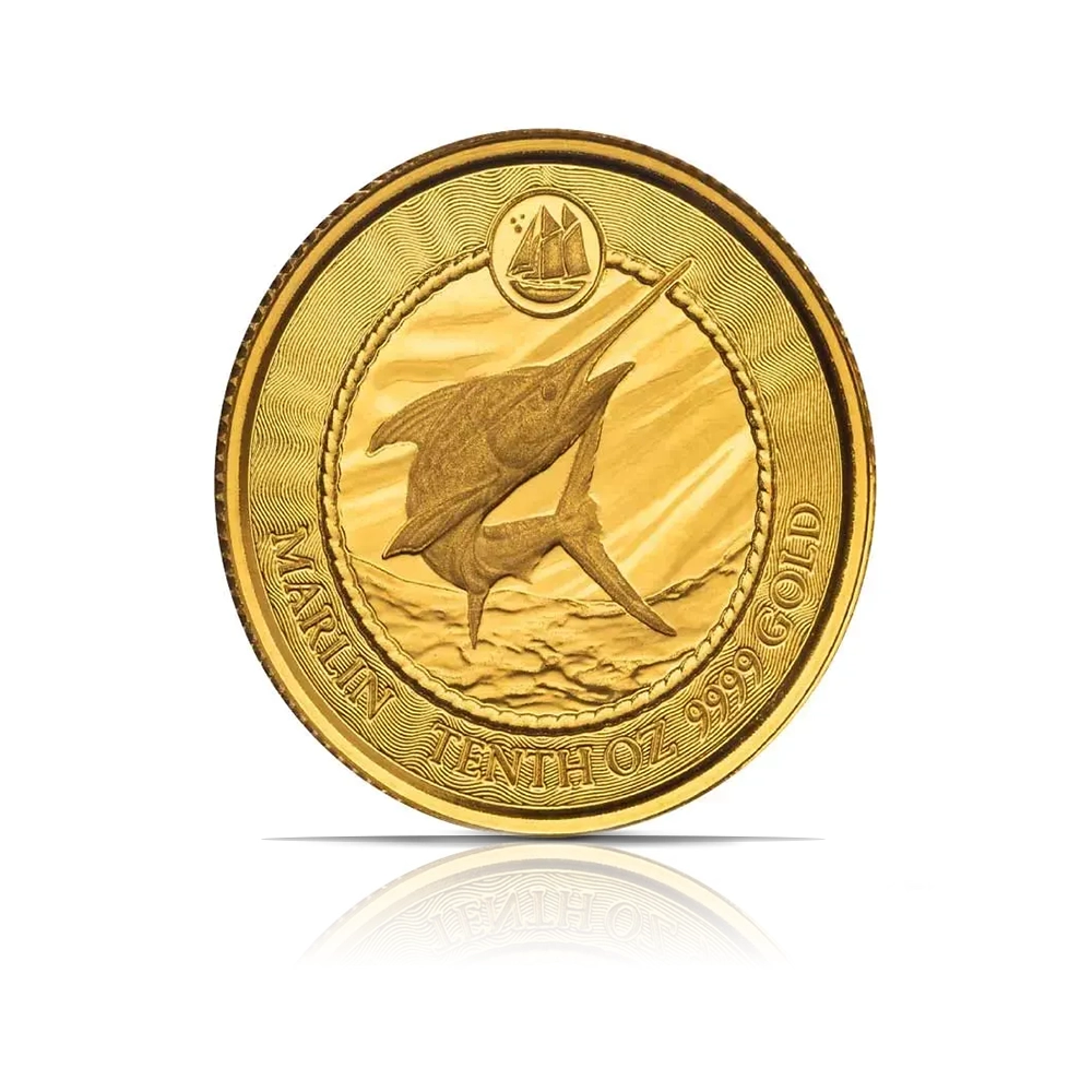 Struck in 1/10 oz gold by the Scottsdale Mint, this coin is part of the Cayman Islands Wildlife series. The obverse features the Cayman Islands coat of arms, while the reverse depicts a Blue Marlin leaping from the water alongside the .9999 fine gold purity. Limited mintage of 2,500 coins.