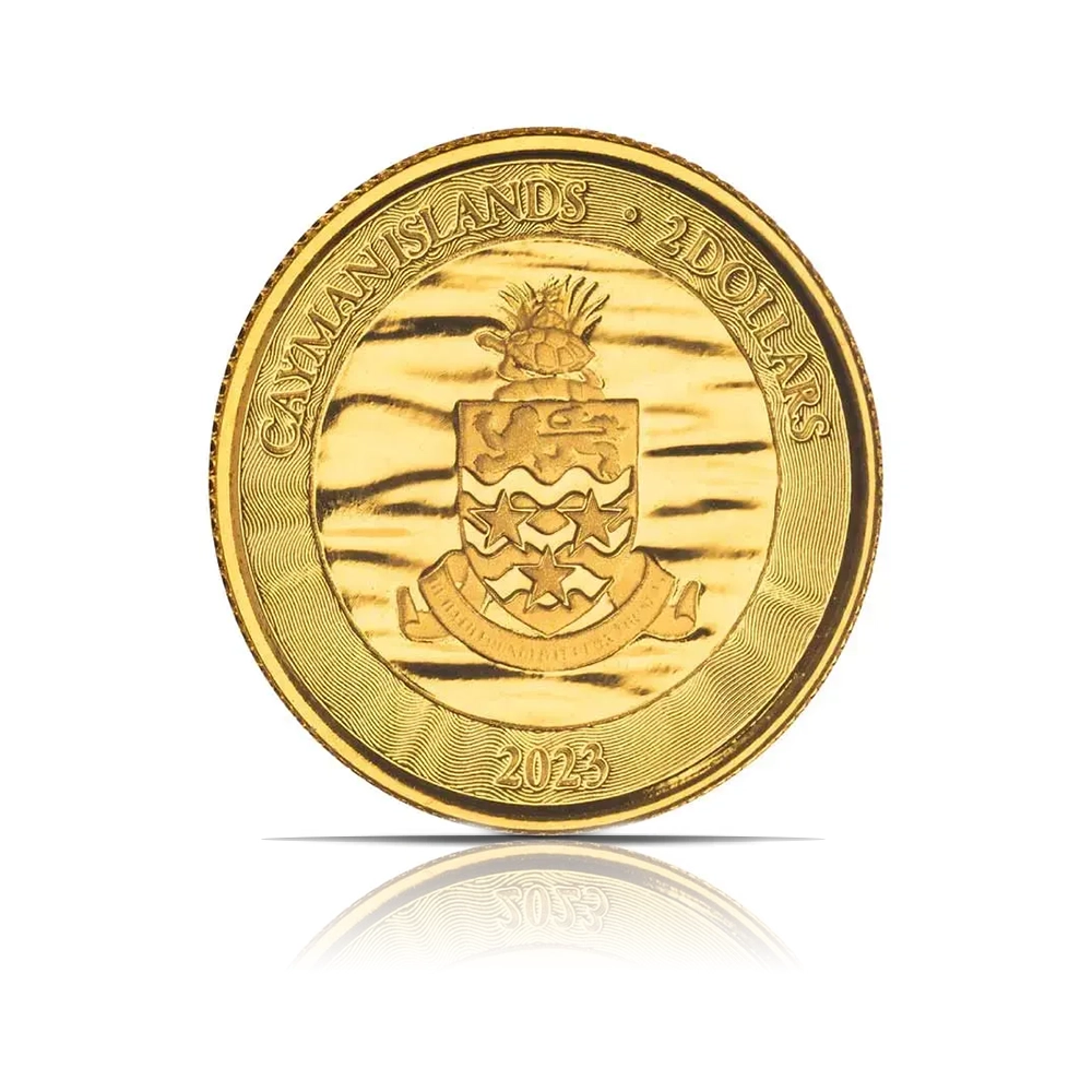 This 2023 1/10 oz gold coin from the Scottsdale Mint is part of the Cayman Islands Wildlife series. The obverse displays the national coat of arms, while the reverse depicts a stingray and the .9999 fine gold purity. Limited mintage of 2,500 coins.