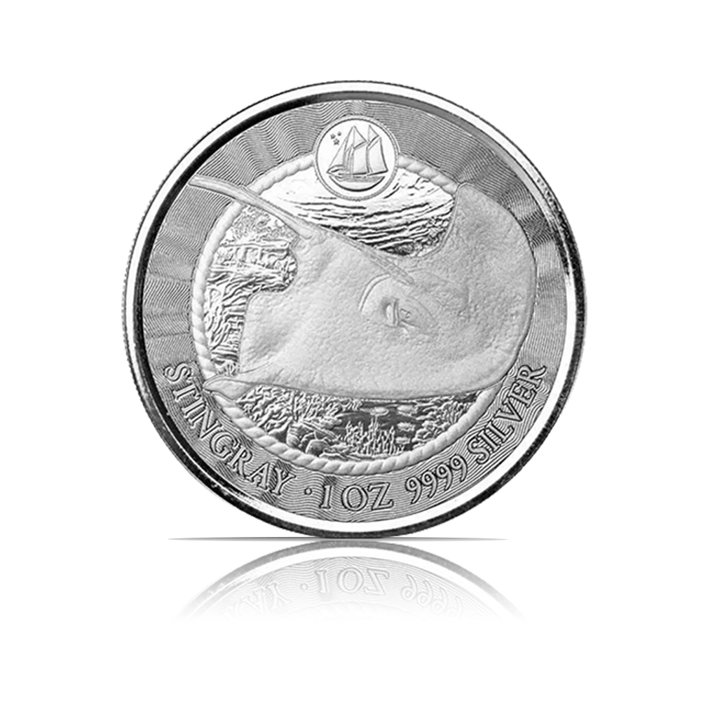 This 2023 1 oz silver coin from the Scottsdale Mint is part of the Cayman Islands Wildlife series. The obverse features the national coat of arms, while the reverse depicts a stingray gliding through the water with .999 fine silver purity. Limited mintage of 10,000 coins.