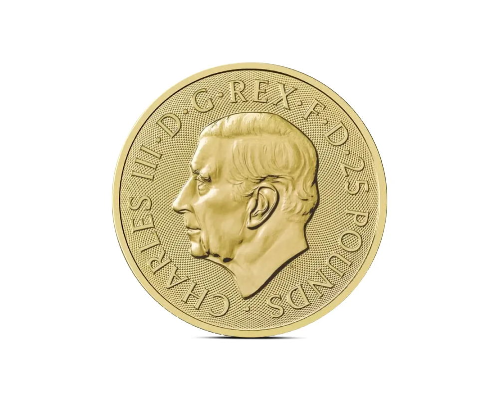 A perfect fractional gold piece. This 2023 Royal Mint Tudor Beasts Bull of Clarence 1/4 oz .9999 pure gold coin is a bold and striking collectible.