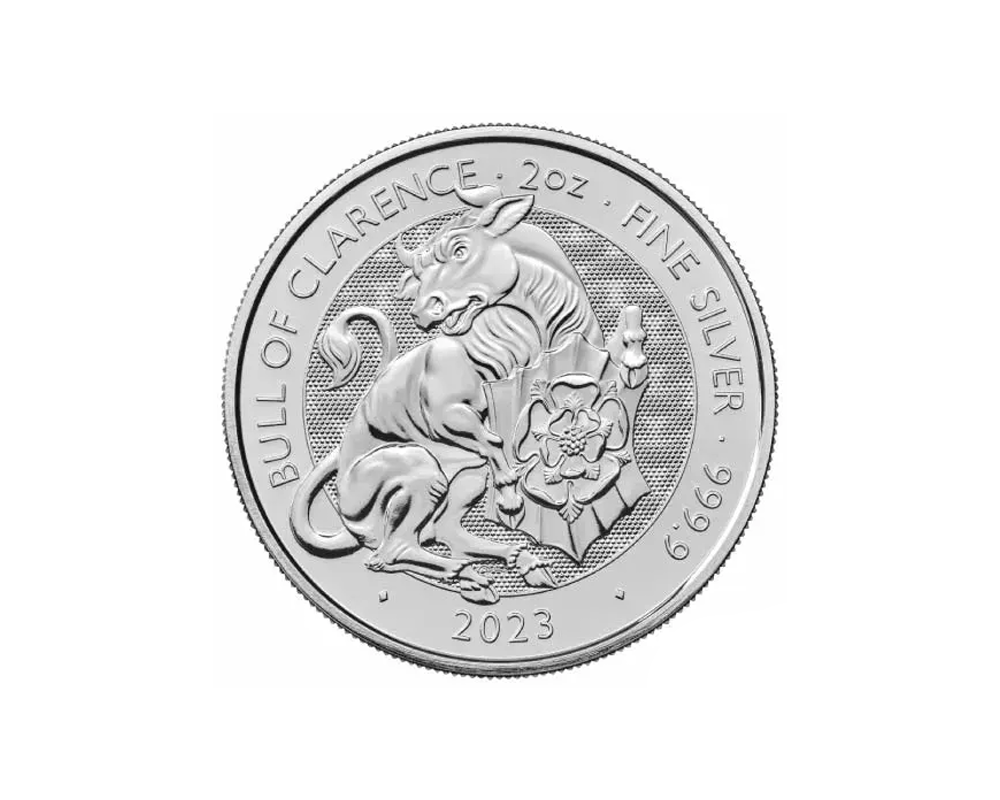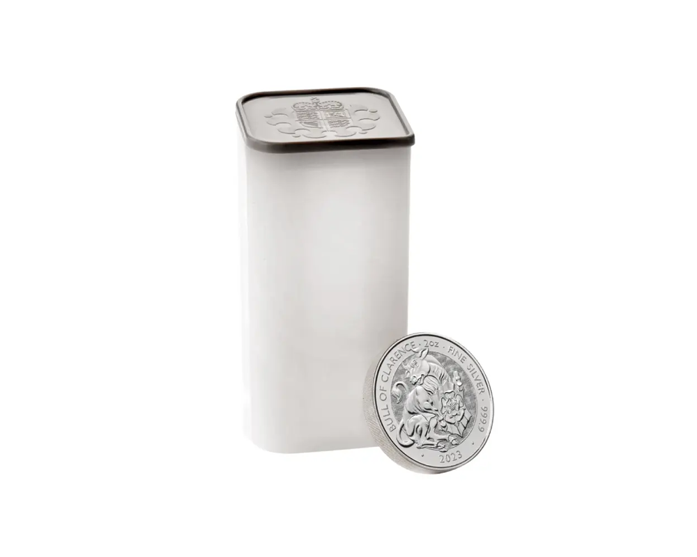 Expand your Tudor Beasts collection! This tube of 10 Royal Mint 2023 Bull of Clarence 2 oz .999 pure silver coins is a great way to acquire bulk bullion.