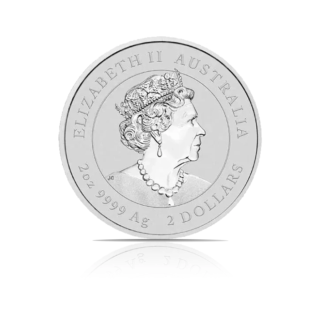This 2023 Brilliant Uncirculated (BU) coin from the Perth Mint in Australia contains 2 oz of .9999 fine silver. It belongs to the Lunar Series III and depicts two rabbits—one alert and one stretching towards a budding branch.