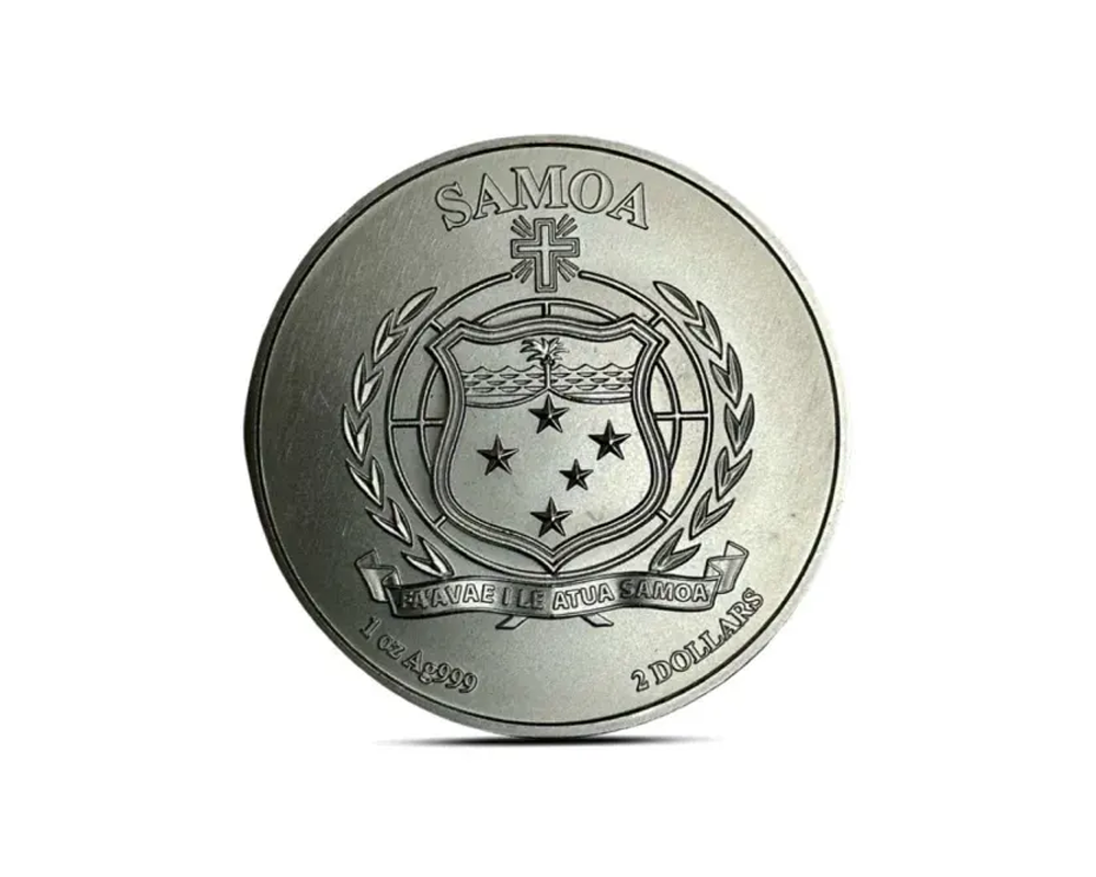 A 2023 coin from Samoa, this 1 oz coin of .999 pure silver features a design by John Mercanti. The reverse depicts a bald eagle in flight, while the obverse displays the national coat of arms of Samoa. The coin has a face value of 2 Dollars (Samoan) and is in Brilliant Uncirculated (BU) condition.