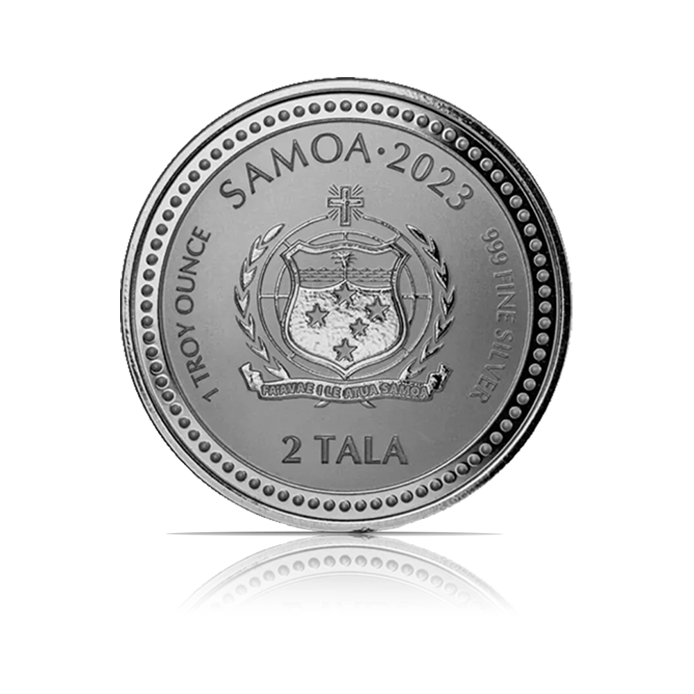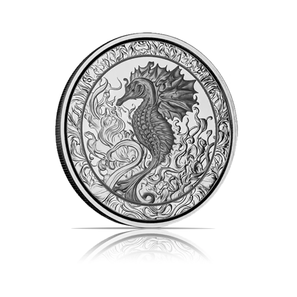 This Brilliant Uncirculated silver coin from the Scottsdale Mint is part of the Samoa Seahorse series. The obverse displays the coat of arms of Samoa, while the reverse features a stylized seahorse amidst underwater flora with .999 fine silver purity. Limited mintage of 15,000 coins.