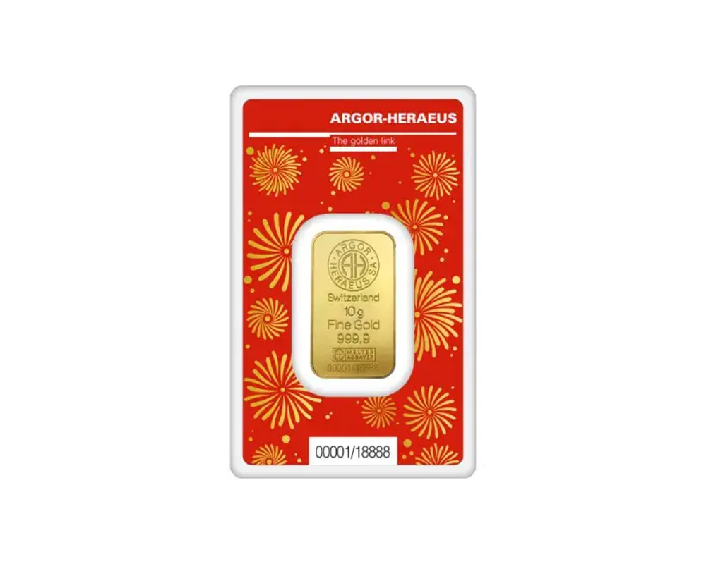 This 10 gram .9999 pure gold bar from the Argor-Heraeus Lunar Series features a unique dragon design on the obverse and the mint’s hallmarks on the reverse.