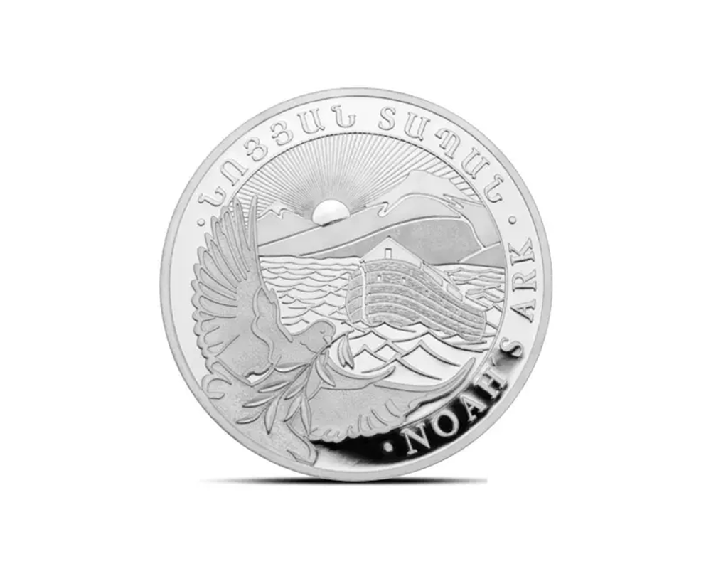 This 10 oz .999 fine silver coin from the Armenia Noah’s Ark series features a design of Noah’s Ark on the obverse, with a dove carrying an olive branch flying toward it.
