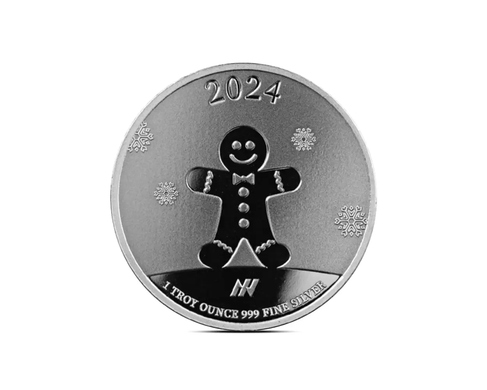 A festive 1 oz .999 pure silver round from Asahi Refining to commemorate the 2024 holiday season.