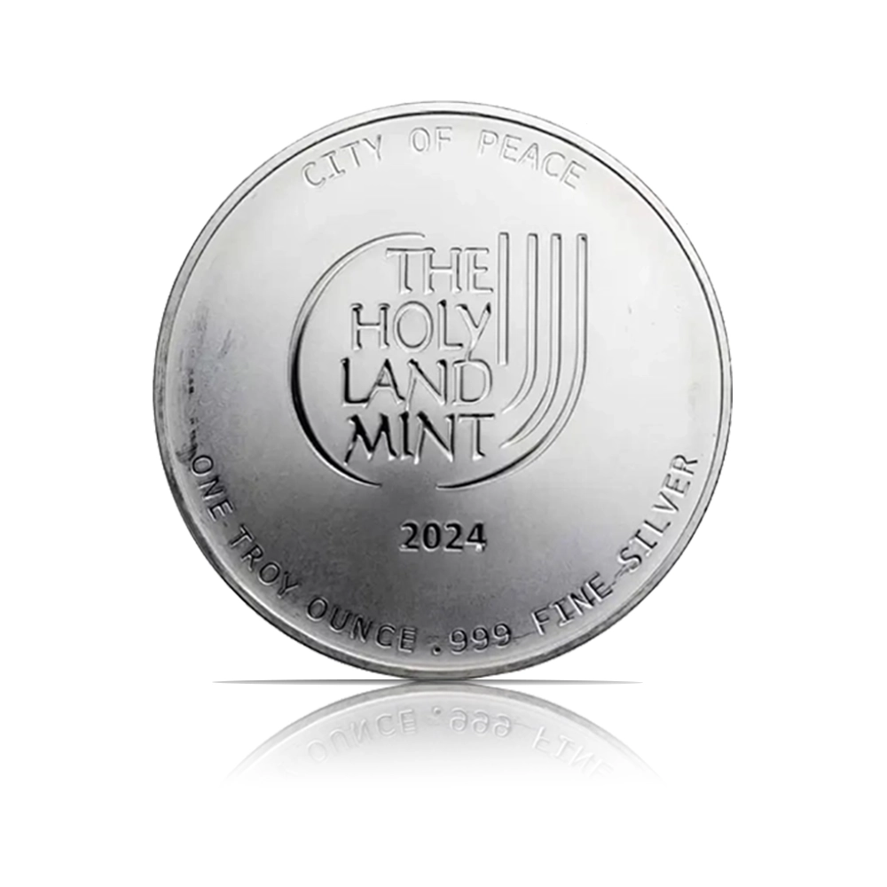 Struck in 1 oz silver by the Holy Land Mint (Hevel) for the Jerusalem series, the obverse features the Lion of Judah and the city’s skyline. The reverse depicts a stylized “Jerusalem” gate design and the .999 fine silver purity.