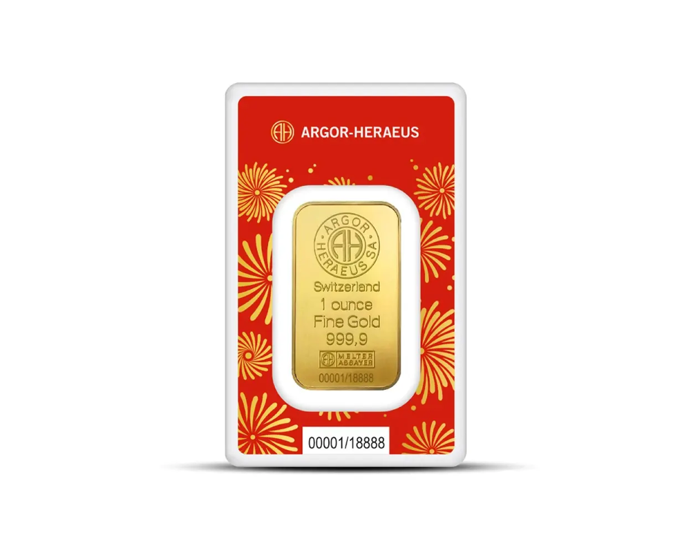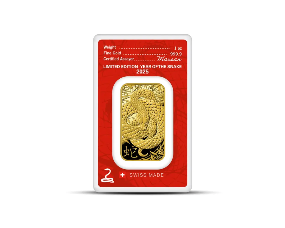 This 1 oz .9999 pure gold bar is from the Argor-Heraeus Lunar Series. The obverse shows an intricate snake, and the reverse has the mint’s official markings.