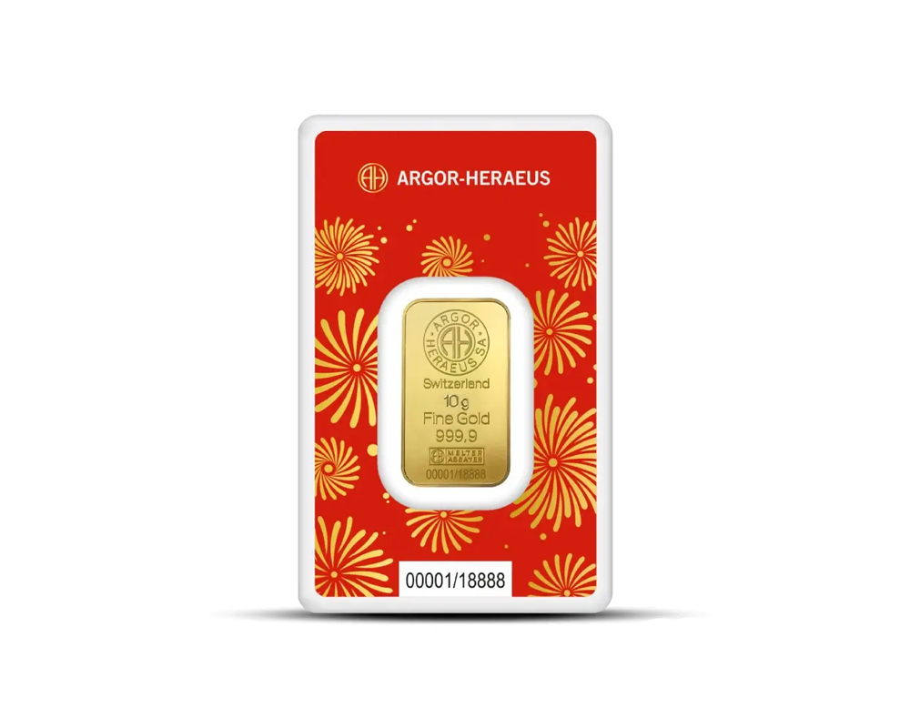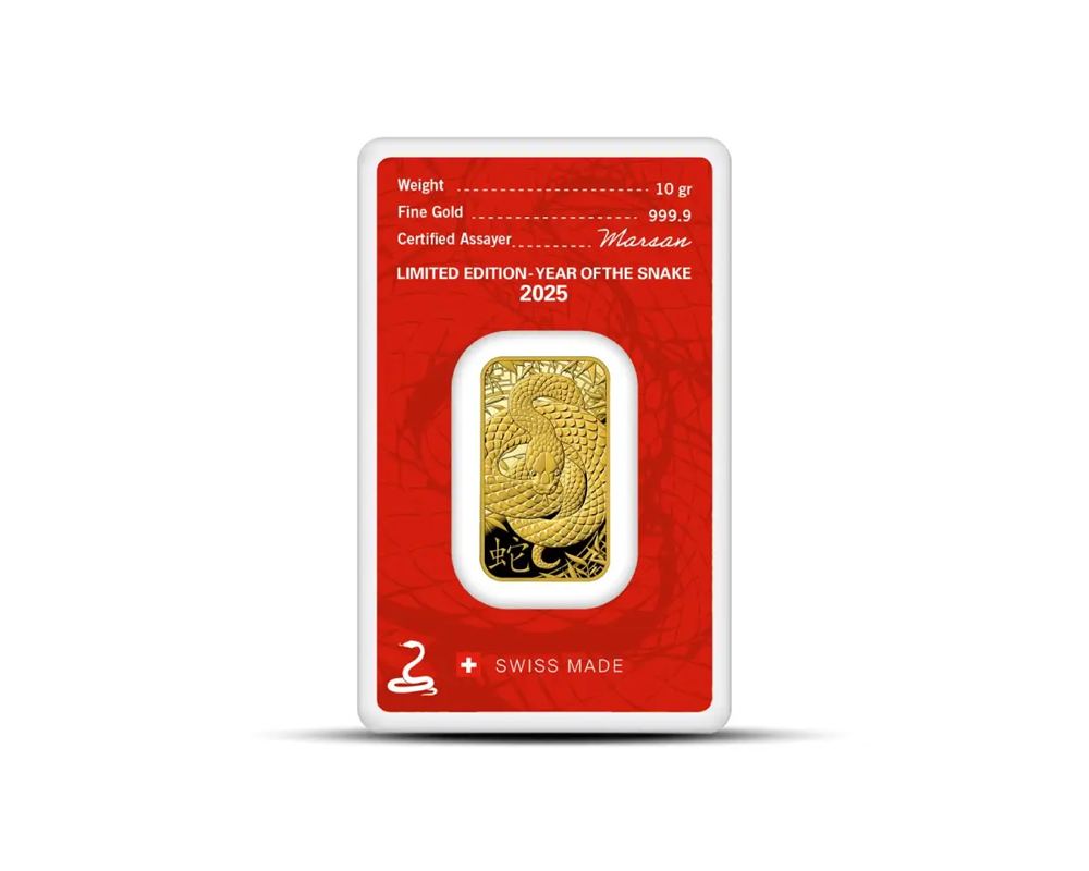 From the Argor-Heraeus Lunar Series, this 10 gram .9999 pure gold bar features a coiled snake on the obverse. The reverse shows the mint’s logo and hallmarks.