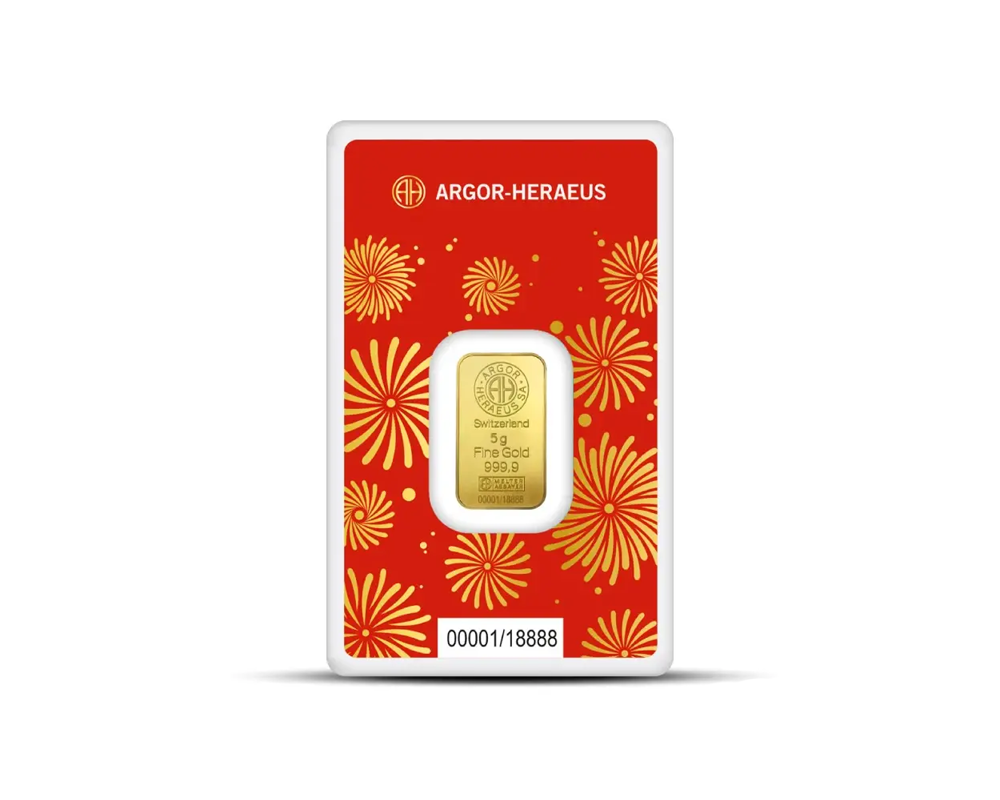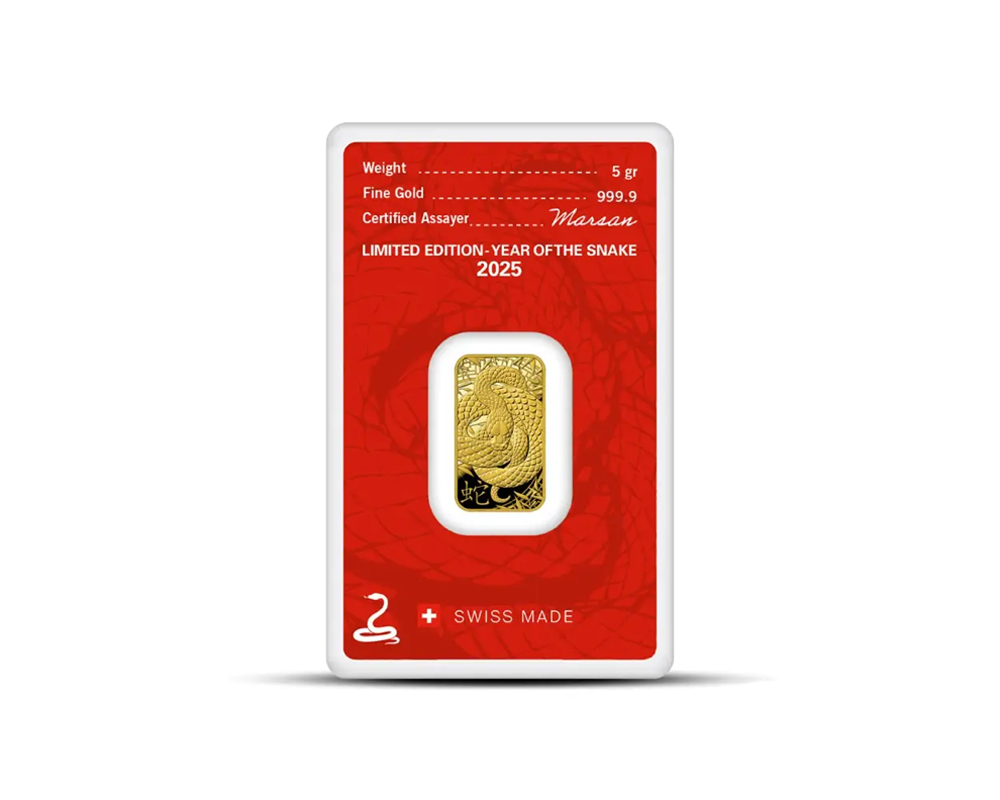 A 5 gram .9999 gold bar from the Argor-Heraeus Lunar Series. The obverse features a snake, while the reverse has the mint’s markings.