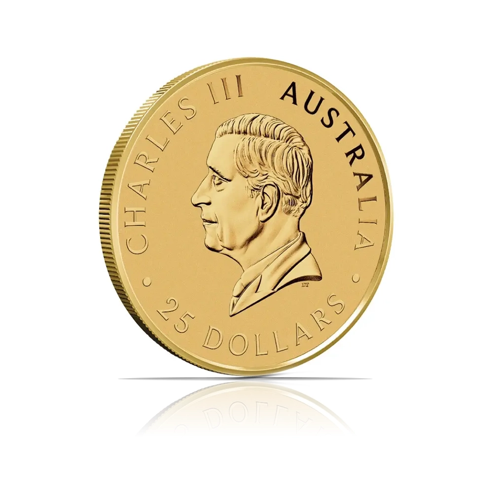 This 2025 Brilliant Uncirculated (BU) coin from the Perth Mint in Australia contains 1/4 oz of .9999 fine gold. It features a new 2025 kangaroo design and is limited to a maximum mintage of 150,000.