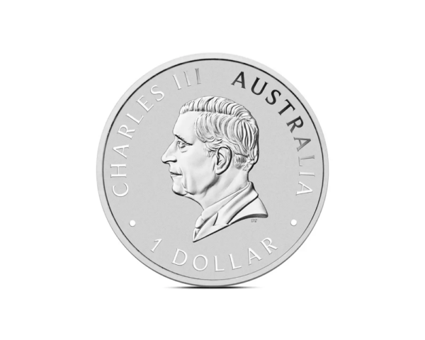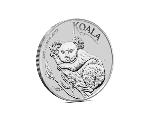 Issued by the Perth Mint in Australia for 2025, this Brilliant Uncirculated (BU) coin contains 1 oz of .9999 fine silver. The reverse displays a detailed koala on a eucalyptus branch, while the obverse features the Dan Thorne effigy of King Charles III.