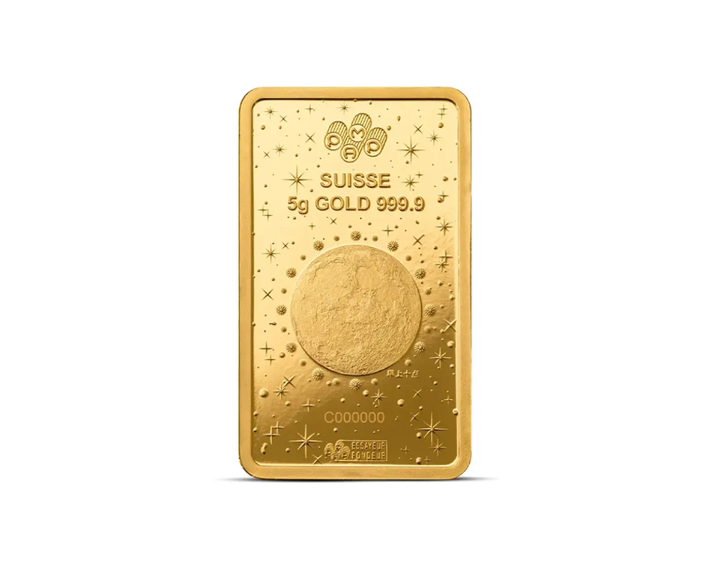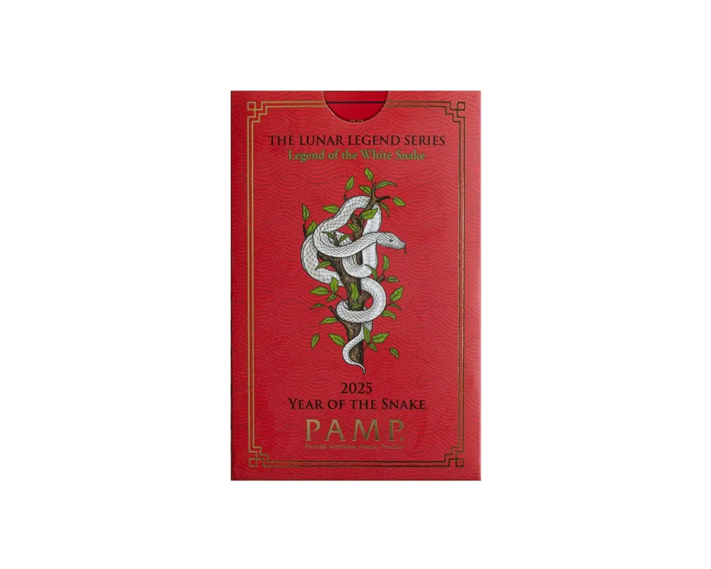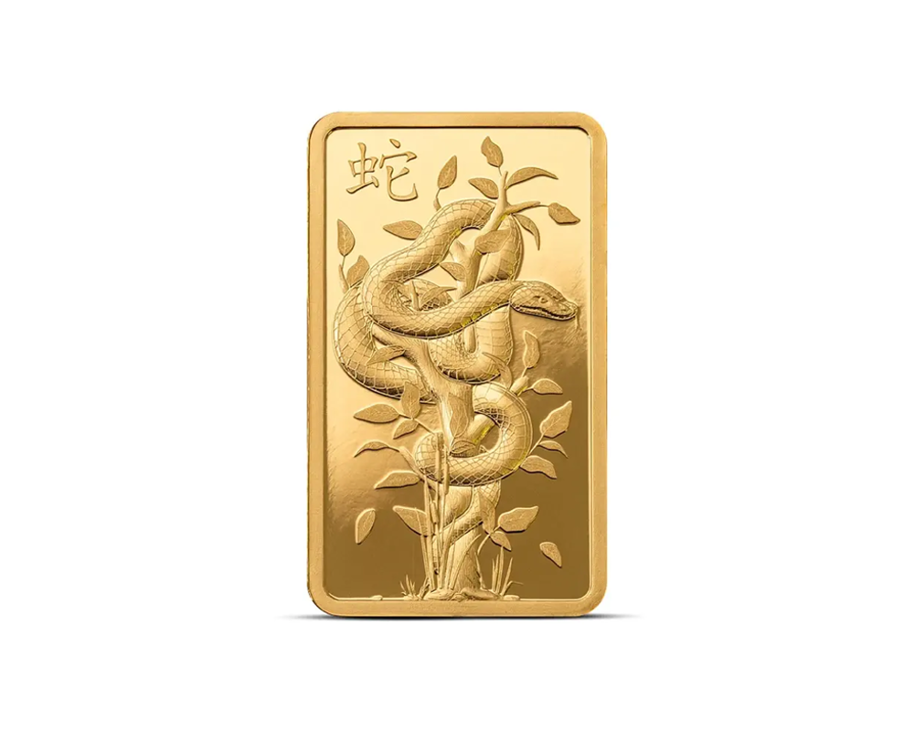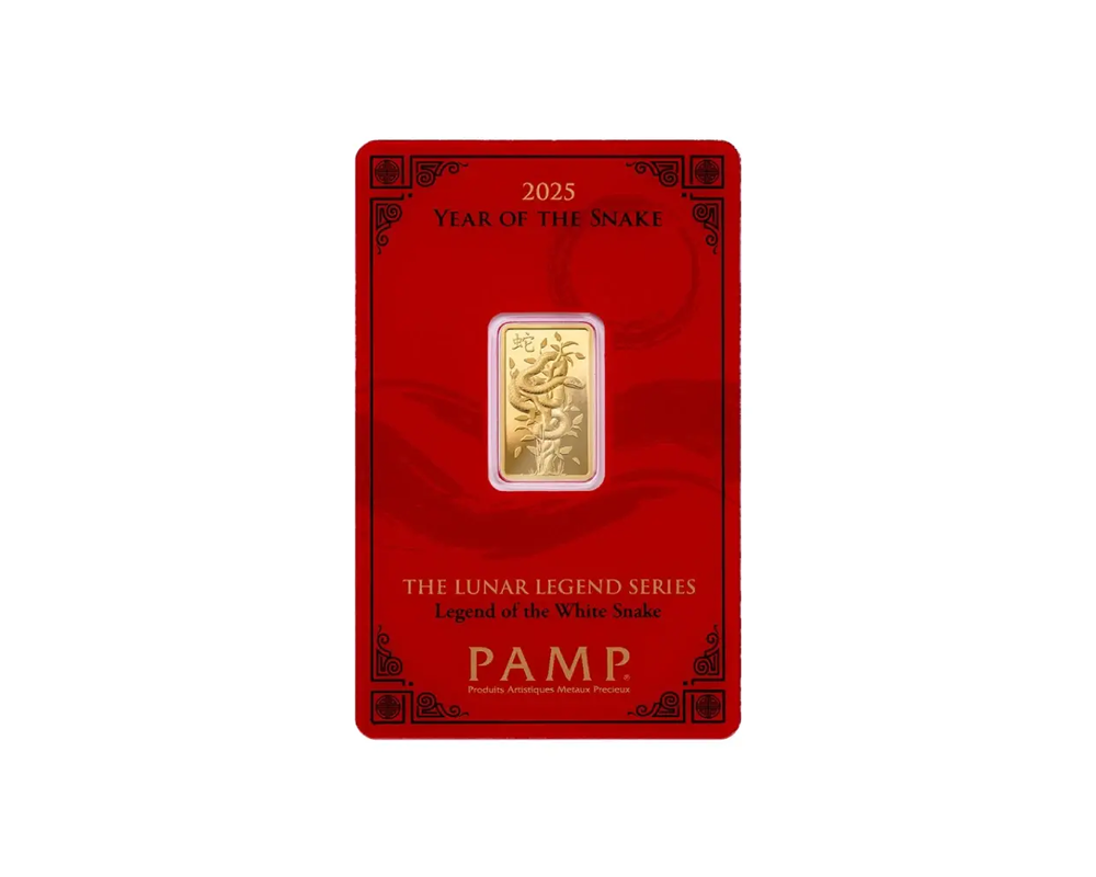 This 2025 PAMP from the Lunar Snake series design is a 5 Gram of .9999 fine gold bar, originating from Switzerland. The obverse features the intricate Lunar Snake motif for the year 2025, while the reverse displays the PAMP logo, purity, weight with unique serial number.