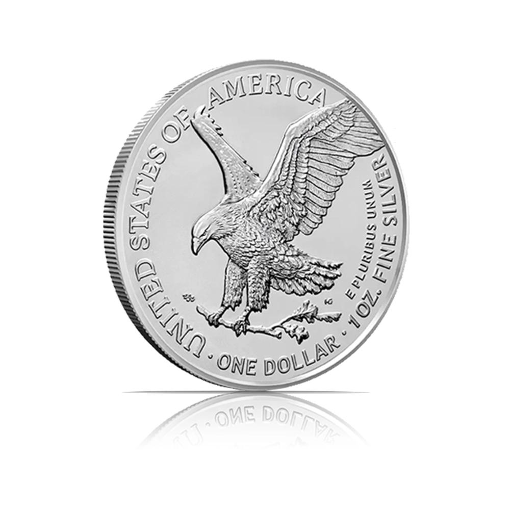 This bulk “Monster Box” contains 500 individual 1 oz silver Brilliant Uncirculated coins struck by the U.S. Mint. The obverse features Adolph A. Weinman’s “Walking Liberty,” while the reverse displays a majestic bald eagle coming in for a landing with an oak branch, finished with .999 fine silver purity.