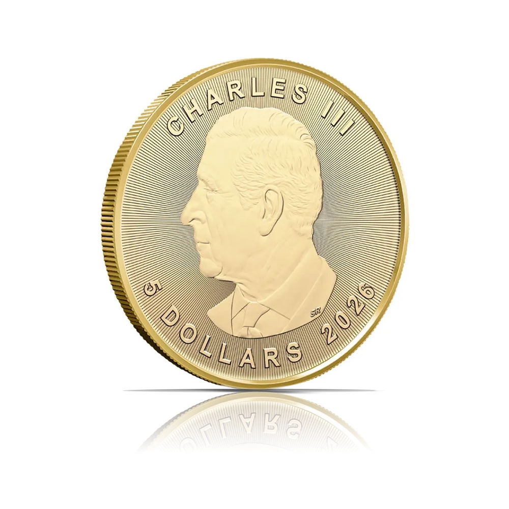 This 2026 gold coin of 1/10 oz is minted by the Royal Canadian Mint. The obverse displays the effigy of King Charles III, while the reverse showcases the internationally recognized Canadian Maple Leaf.