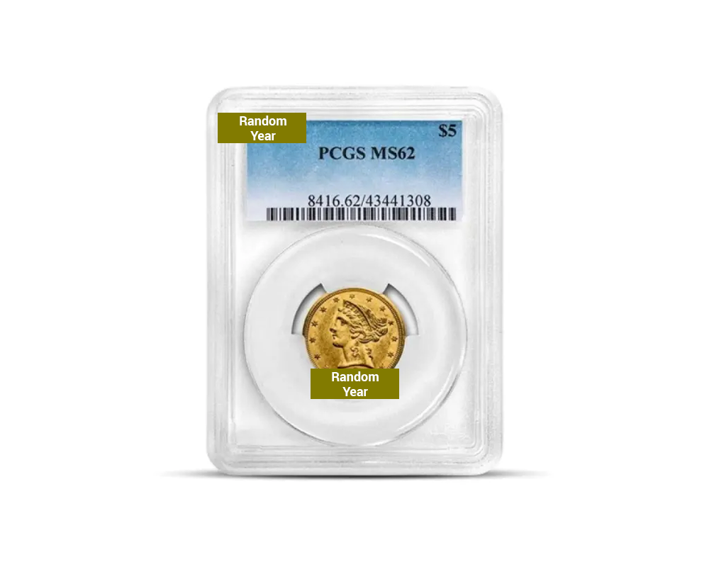 A U.S. coin minted from 1839-1908 with the classic Coronet Head (Liberty) on the obverse and a heraldic eagle on the reverse. Certified in Mint State (MS62) by NGC or PCGS, it contains 0.24187 oz of .900 fine gold.