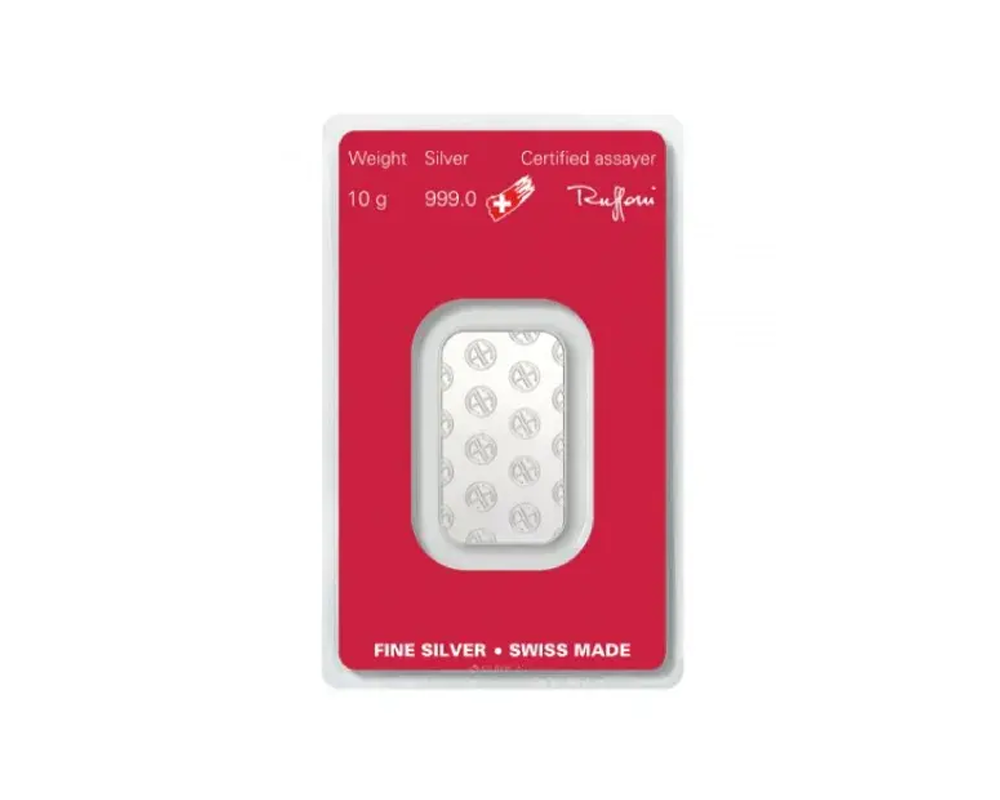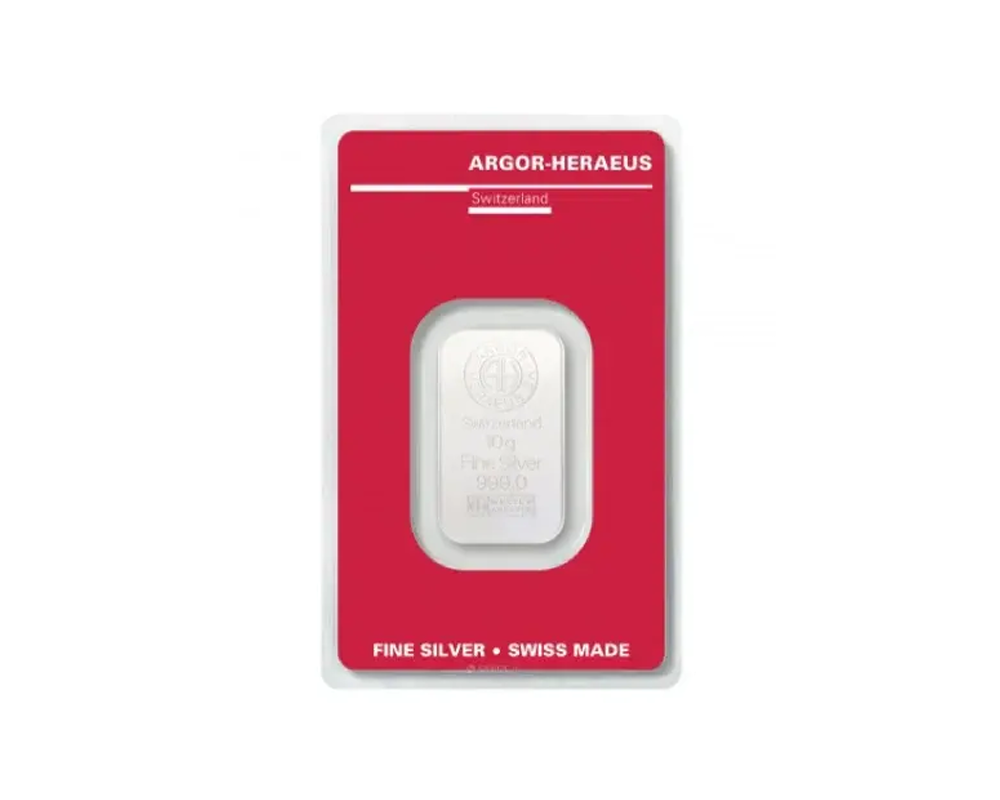 A simple 10 gram .999 pure silver bar from Argor-Heraeus. Standard markings are on the obverse, and the reverse is blank.