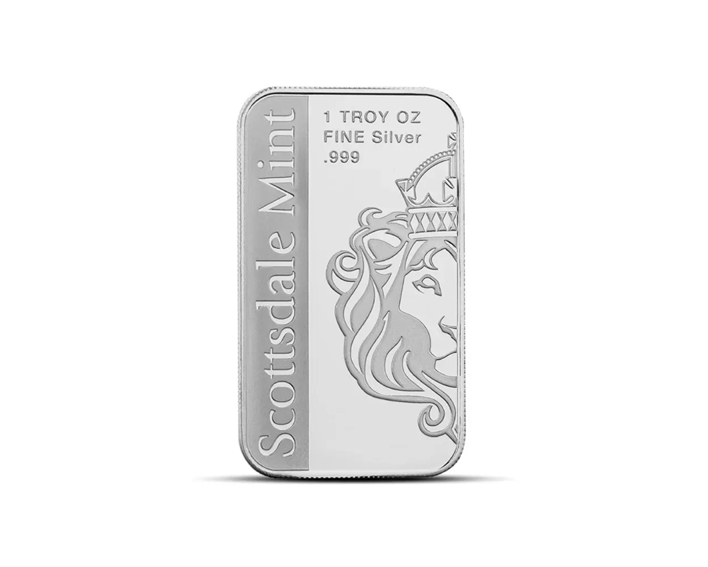 This 1 oz .999 fine silver bar from the Scottsdale Mint features a vibrant, colored patriotic design. The design depicts a powerful bald eagle with an American flag shield, representing liberty and justice. The bar is minted with a classic, high-quality finish.