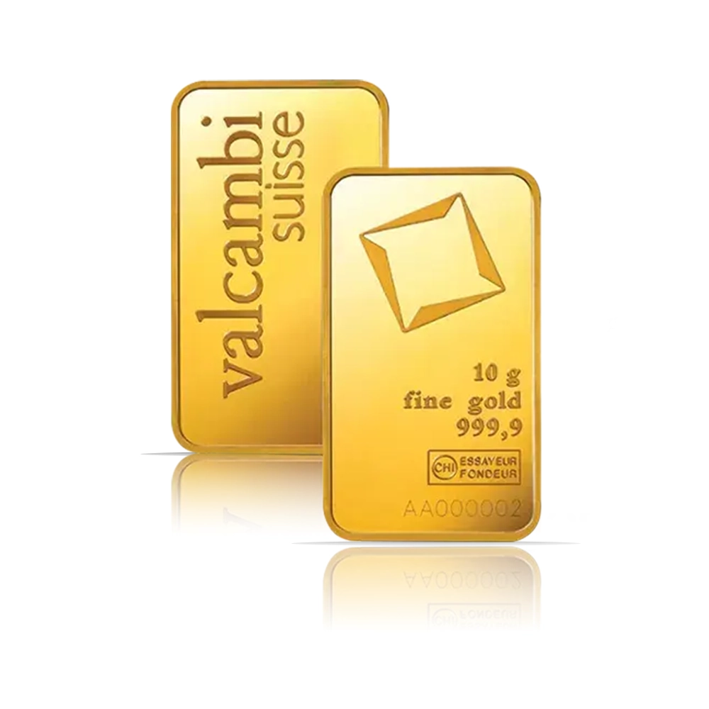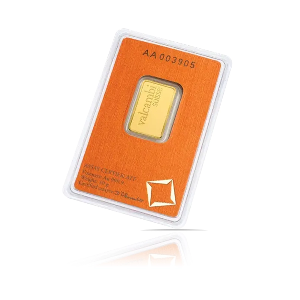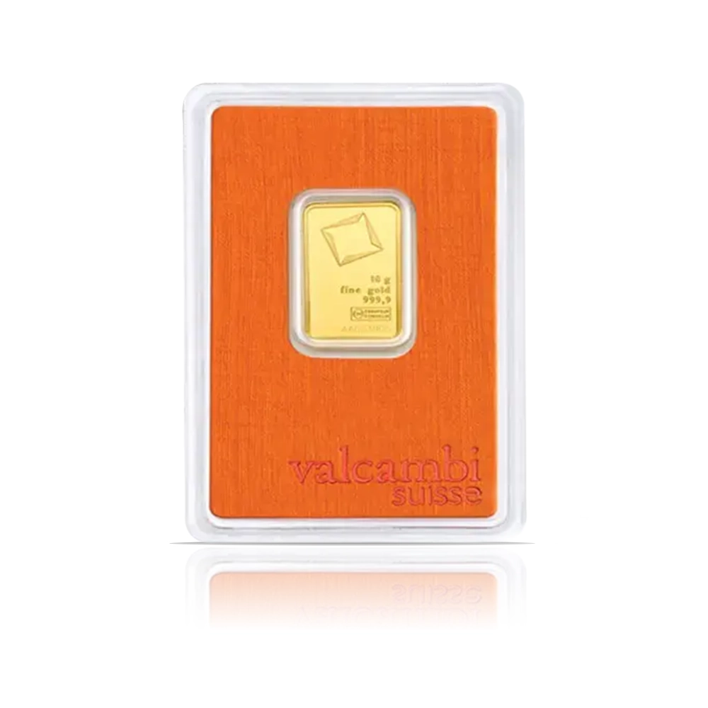 A minted 10 gram .9999 fine gold bar featuring a sleek, modern finish. The obverse displays the Valcambi Suisse logo, weight, and serial number. The reverse is decorated with a repeating logo pattern. Comes in a protective assay card.