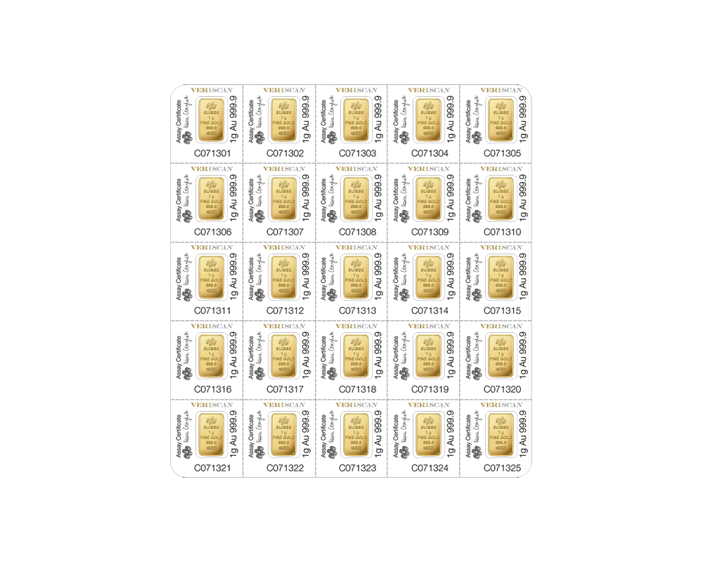 This PAMP Multigram sheet contains 25 x 1 Gram of .9999 fine gold bars, originating from Switzerland. Each individual 1-gram bar features the PAMP logo, purity, and weight.