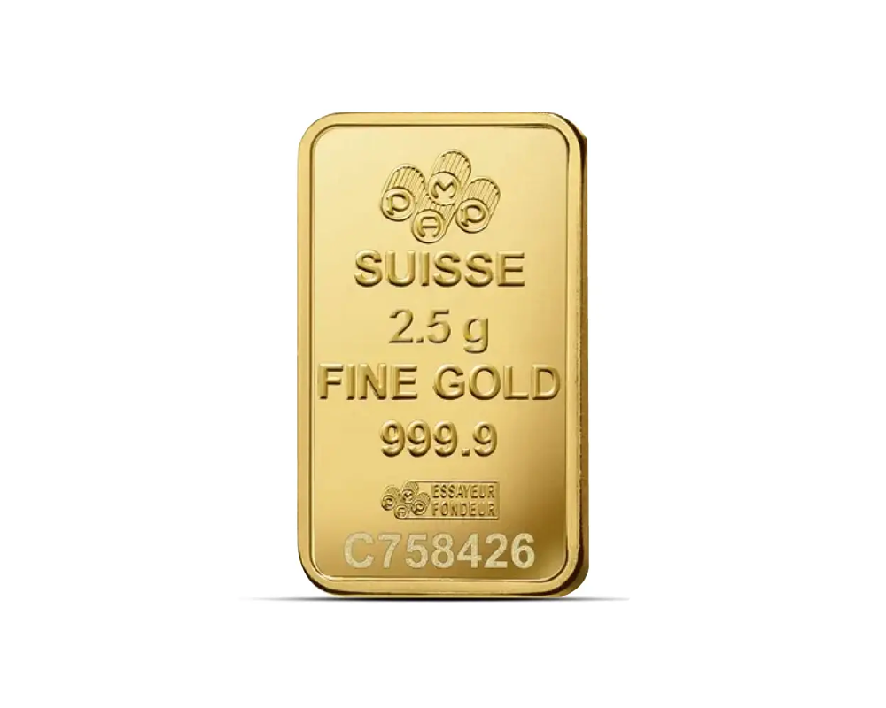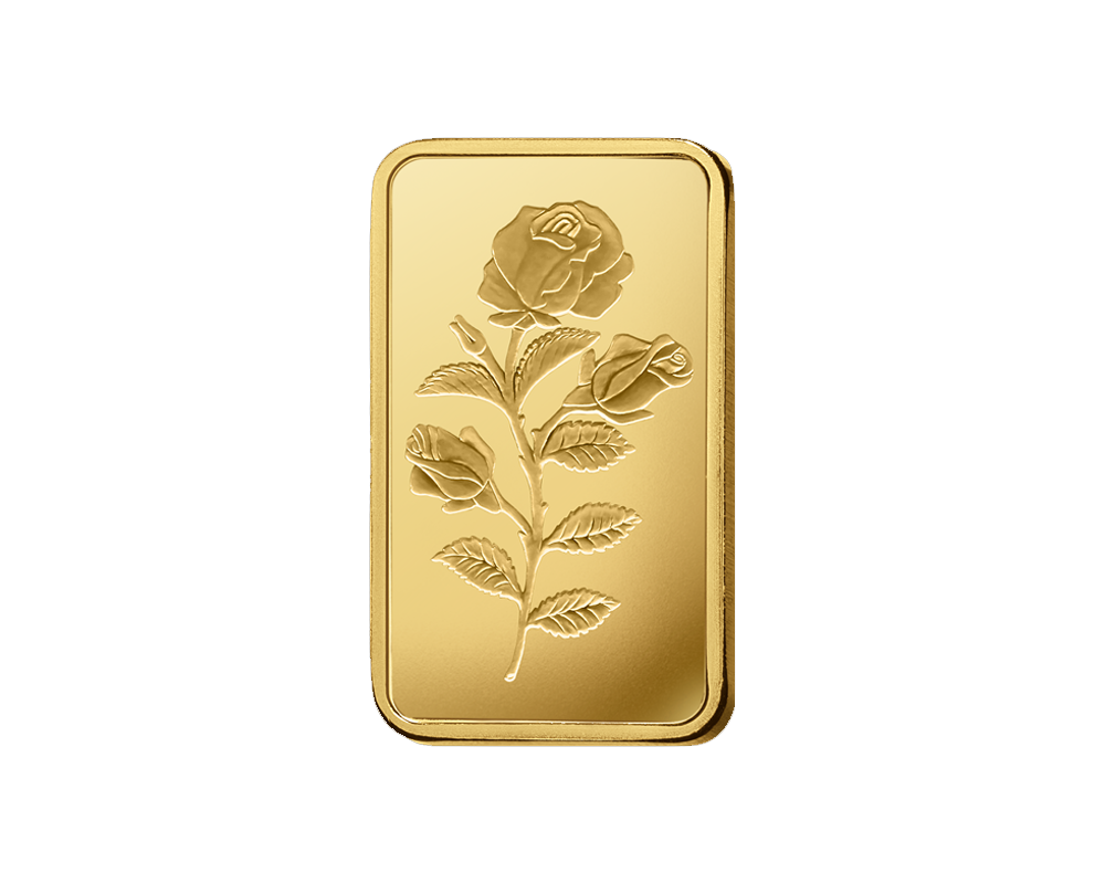 This PAMP 2.5 Gram of .9999 fine gold bar, originating from Switzerland, features an elegant Rosa (rose) design. In the reverse, the PAMP logo, purity, weight with unique serial number.