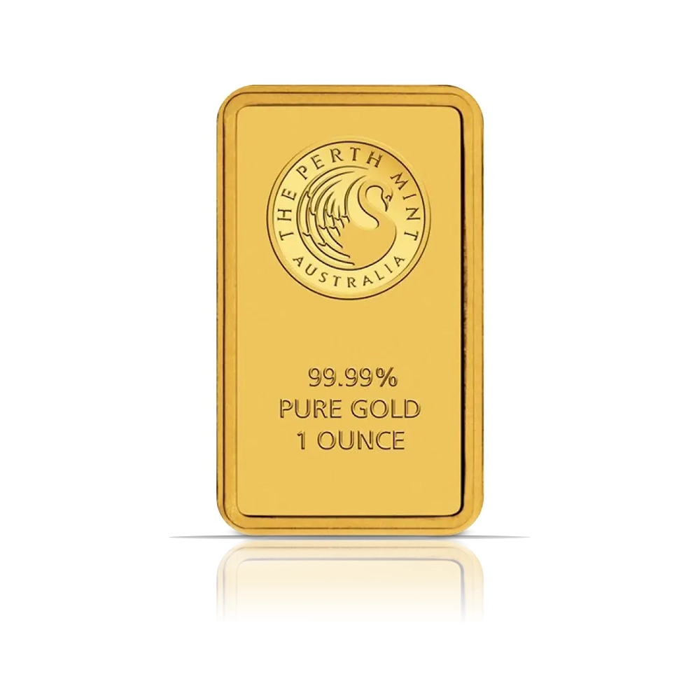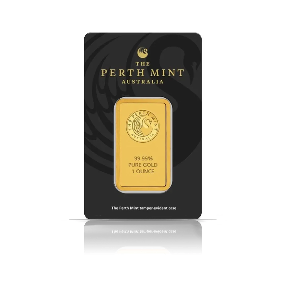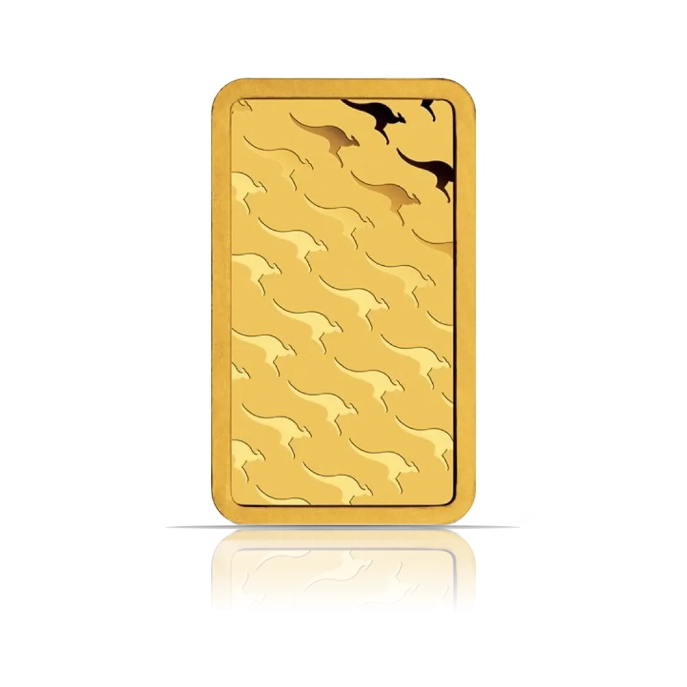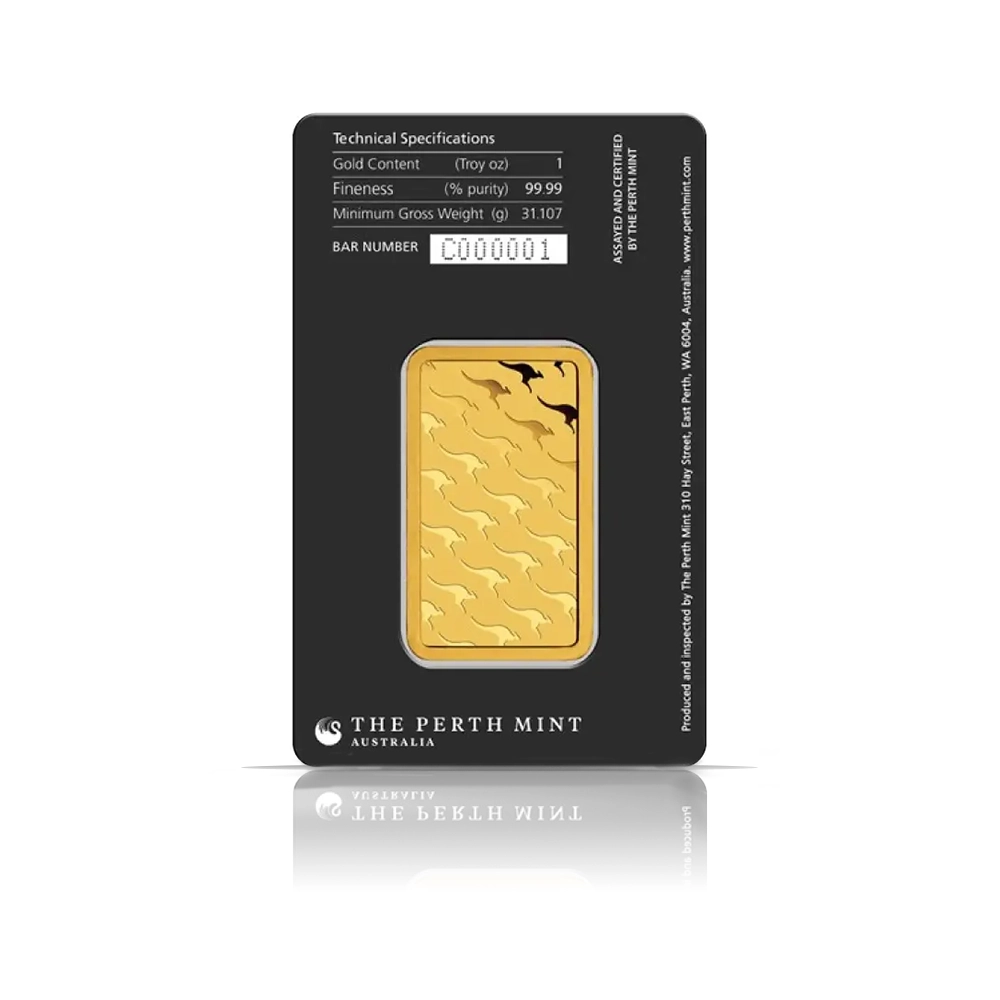 This Random Year minted bar from the Perth Mint in Australia contains 1 oz of .9999 fine gold. It displays the LBMA-accredited swan logo and a repeating kangaroo reverse, secured in a tamper-evident assay card.