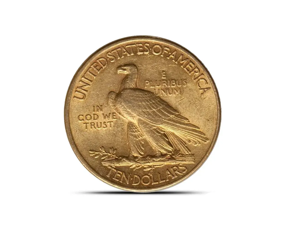A pre-1933 U.S. gold coin with a $10 face value. This 0.48375 oz coin is .900 fine gold and features a unique incuse design. The coin is in Extremely Fine (XF) condition, showing only light wear.