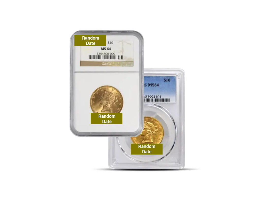 This random year dated Pre-1933 $10 Liberty Eagle .900 fine gold coin, graded MS64 by NGC or PCGS, is a classic piece of American numismatic history. Designed by Christian Gobrecht, it features an iconic Liberty head on the obverse and a powerful heraldic eagle on the reverse.