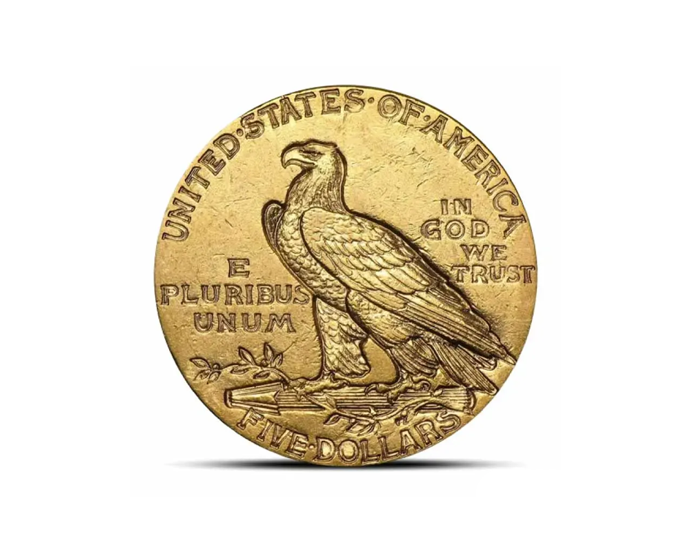 This U.S. Mint coin is a $5 Indian Half Eagle from the pre-1933 era. It contains .24187 oz of .900 fine gold and features a Native American head on the obverse and an eagle on the reverse in an incuse design. The coin is in About Uncirculated (AU) condition.