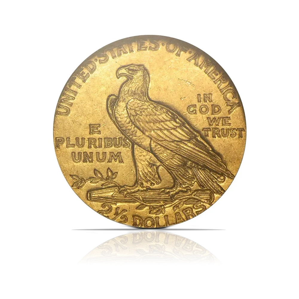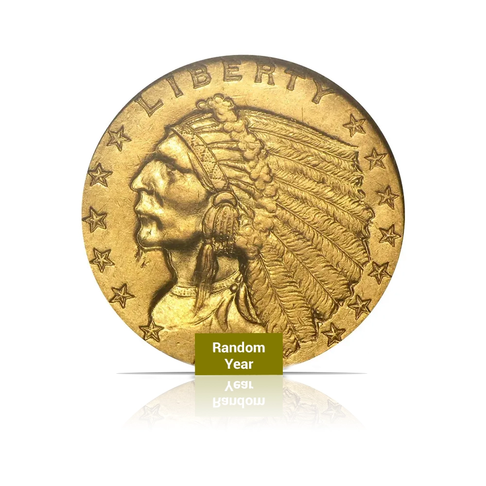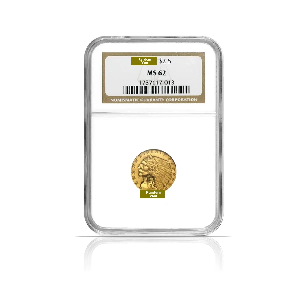 This gold coin contains .1209 oz of fine gold and features the distinctive sunken-relief design. The obverse shows a Native American in profile, while the reverse depicts a proud standing eagle. Graded MS63 by NGC or PCGS with .900 fine gold purity.