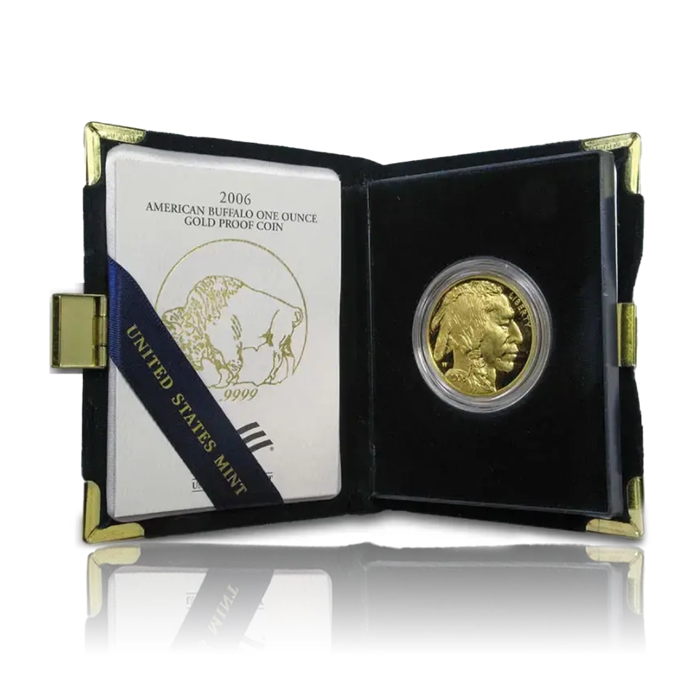 This random year dated America Buffalo 1 oz gold proof coin is .9999 fine gold. It features James Earle Fraser’s Native American and American Bison designs. It is struck by the United States Mint and comes in its original mint box.