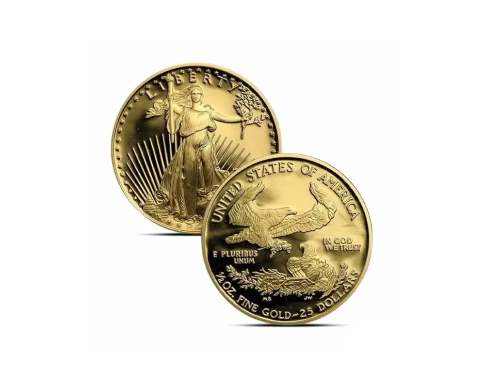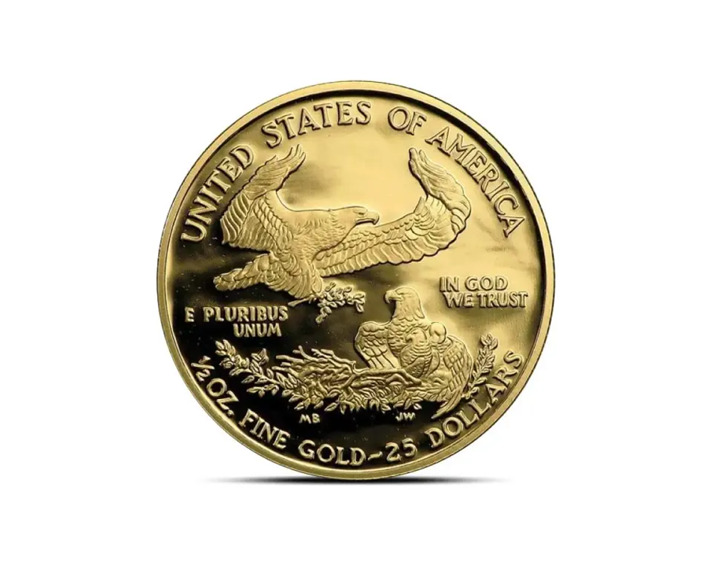 This random year dated America Eagle 1/2 oz .9167 of fine gold proof coin comes in its original mint box. It features Augustus Saint-Gaudens’ iconic Liberty striding forward on the obverse and a powerful family of eagles on the reverse.