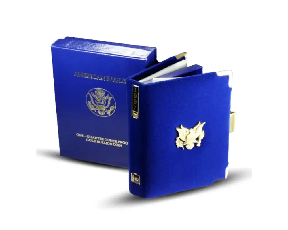 This random year dated American Eagle 1/4 oz gold proof coin is .9167 fine gold. It features Augustus Saint-Gaudens’ Liberty design and a family of eagles on the reverse. It is produced by the United States Mint and comes in its original mint box.