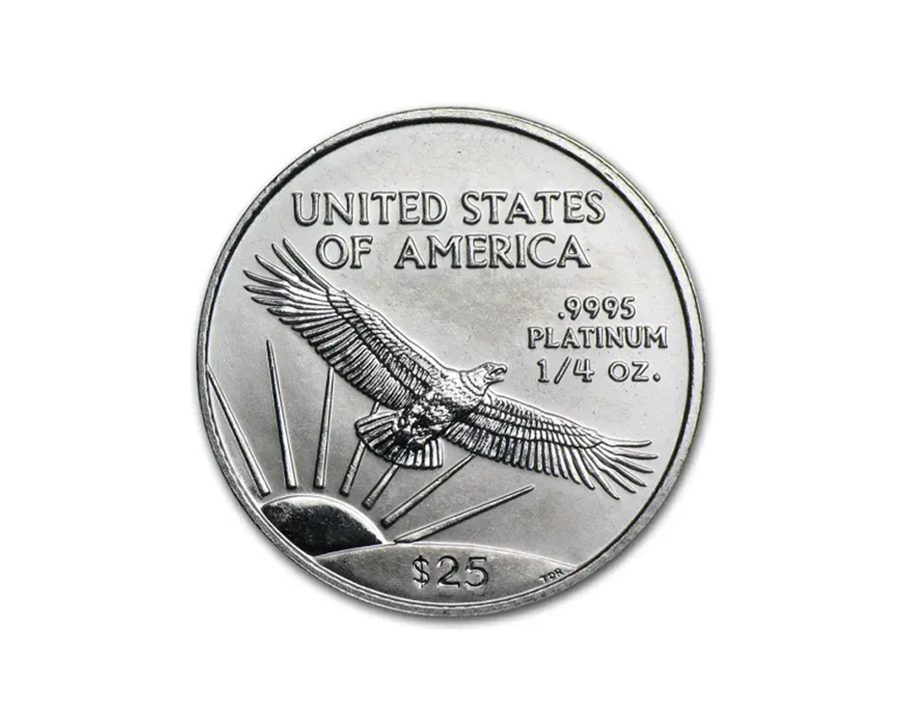 This random year dated American Eagle of 1/4 oz coin is a .9995 of fine platinum. It features the Statue of Liberty on the obverse and an American eagle on the reverse. It is produced by the United States Mint.