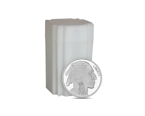 This tube contains twenty 1 oz silver rounds produced by the SilverTowne Mint for the Buffalo series. The obverse features a profile portrait of a Native American, while the reverse depicts an American Bison with .999 fine silver purity.