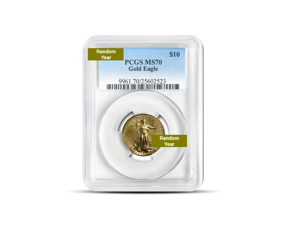 A flawless American classic from the U.S. Mint. This Random Year American Eagle 1/4 oz .9167 gold coin is graded MS70 and certified by NGC or PCGS.