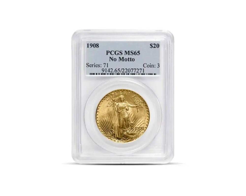 1908 – $20 St Gaudens “No Motto” Gold Coin (MS65, NGC or PCGS)